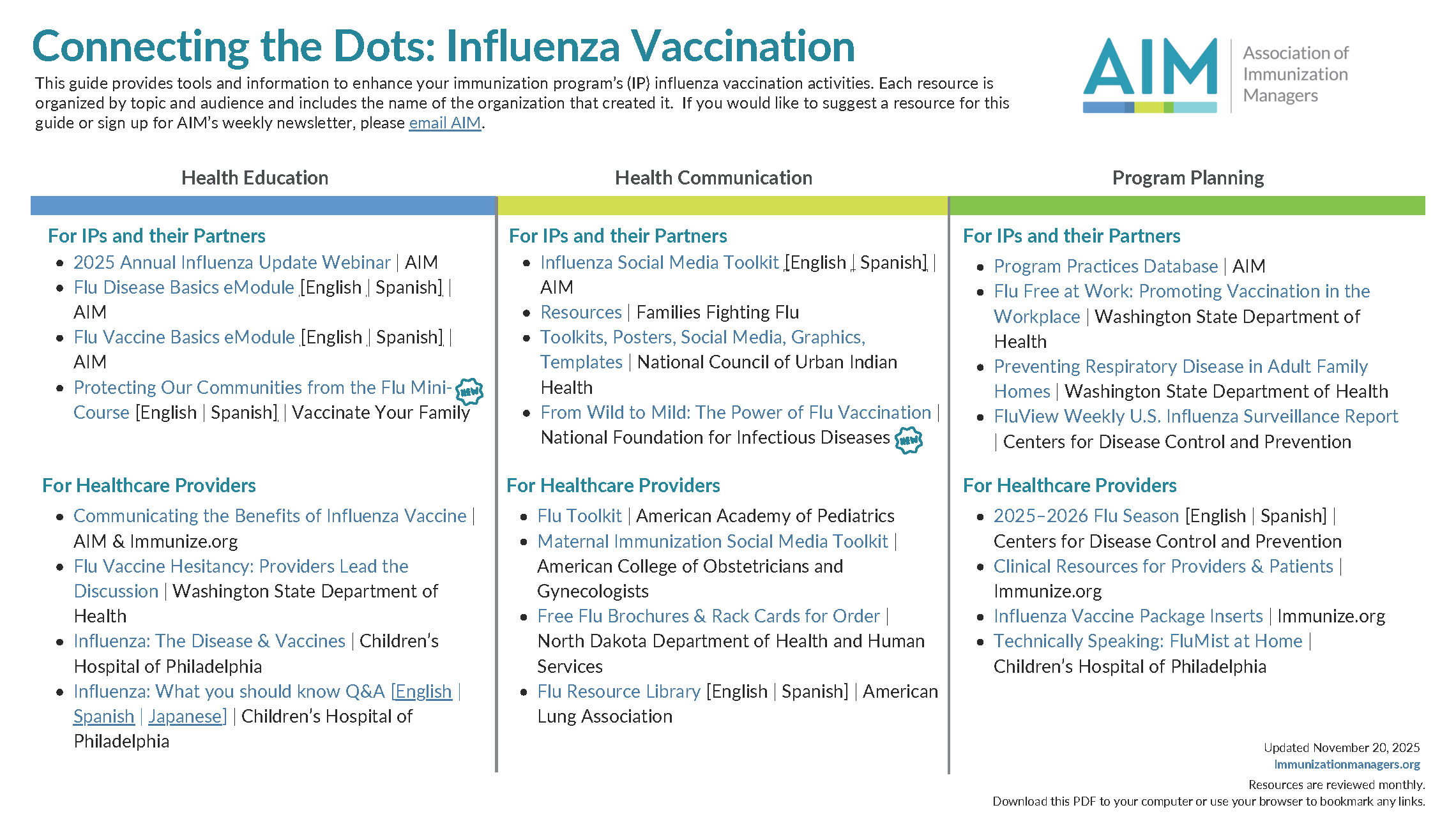 Updated monthly, Connecting the Dots serves as a centralized, go-to reference for influenza vaccination resources. If you have a resource to suggest for the next update, please email AIM.