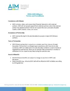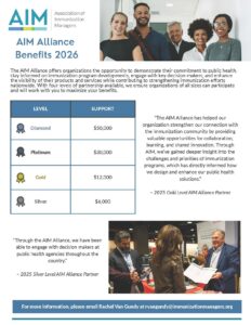 - Stay informed and engaged with the evolving immunization environment through exclusive access to AIM Alliance webinars, regular updates, and direct connection with state, local, and territorial immunization program staff on timely topics, policy changes, and program priorities.
