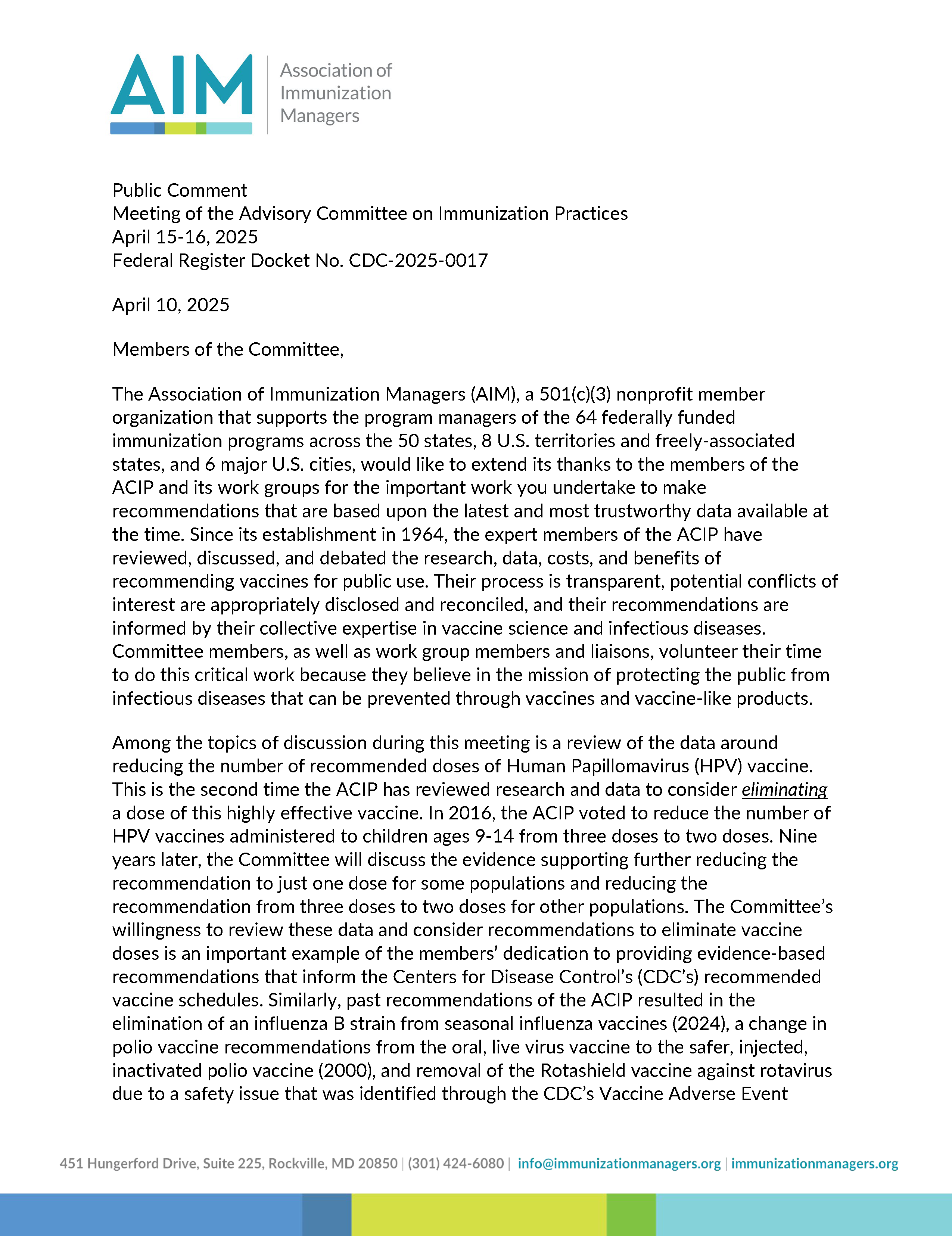 AIM submitted public comment for the April 15-16, 2025, meeting of the Advisory Committee on Immunization Practices (ACIP).