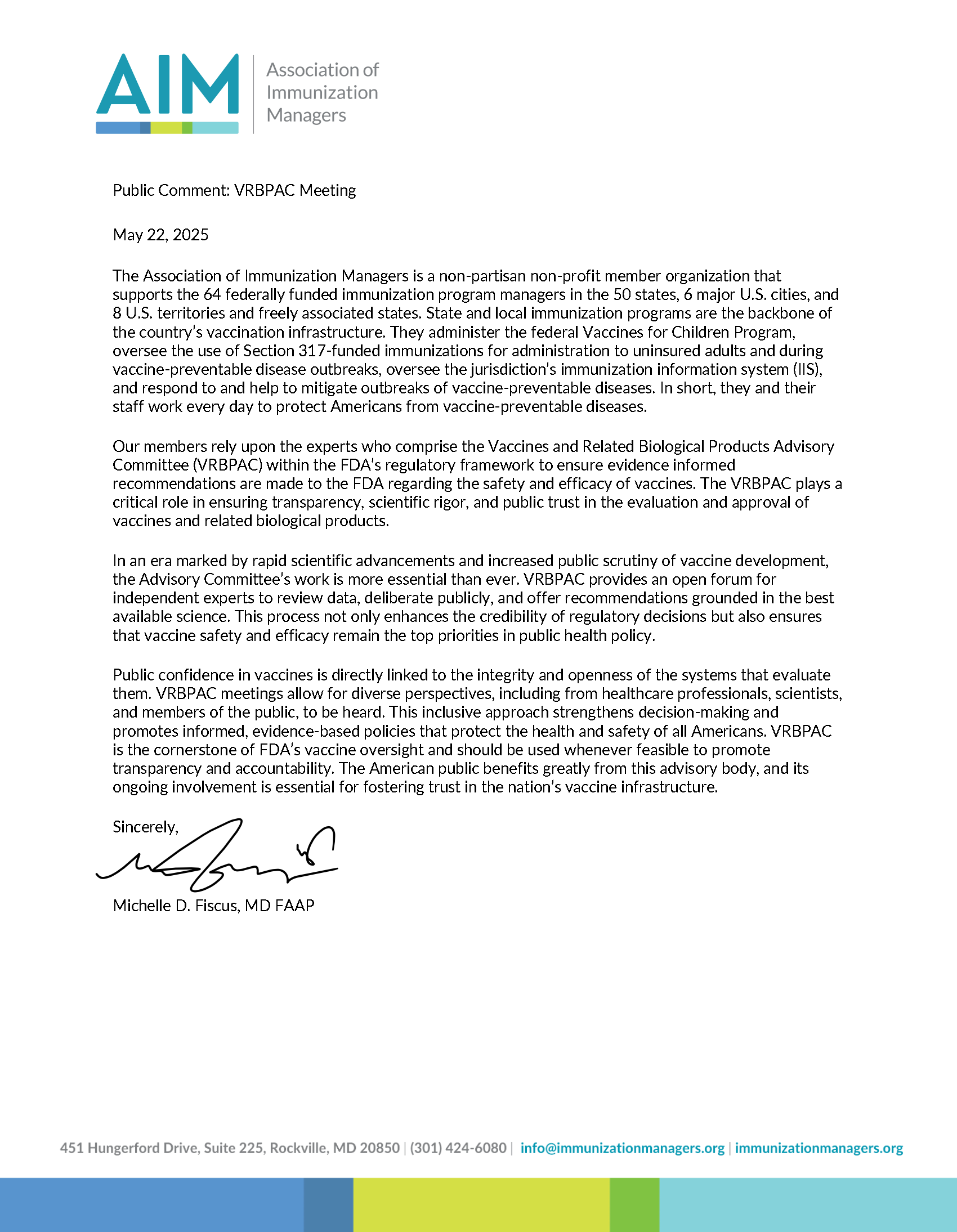 AIM submitted public comment for the May 22, 2025, meeting of the Vaccines and Related Biological Products Advisory Committee (VRBPAC).