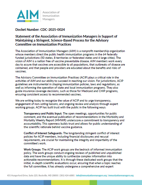 On June 20, AIM submitted a statement in support of maintaining a stringent, science-based process for the Advisory Committee on Immunization Practices (ACIP).