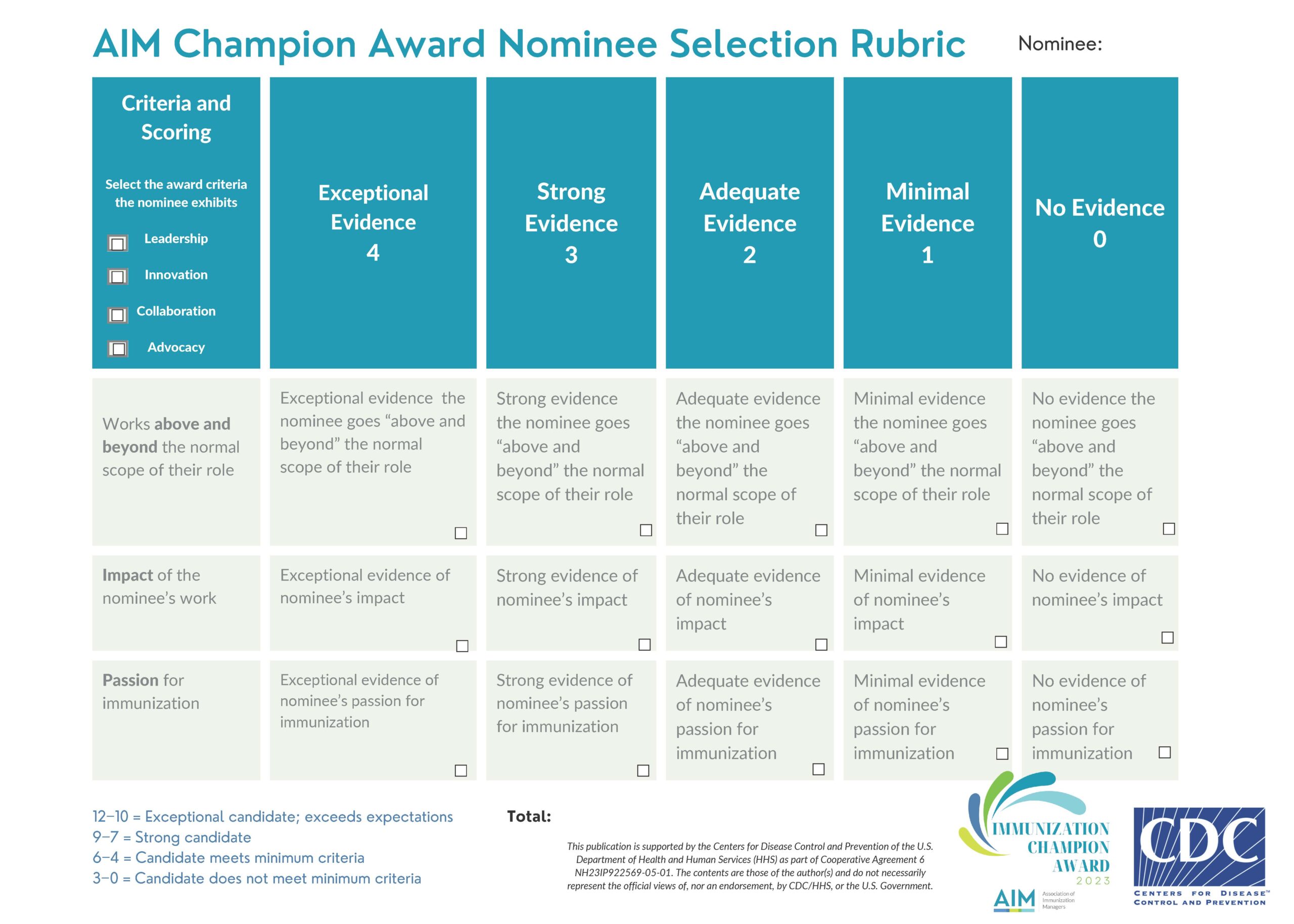This rubric displays the award criteria the nominee exhibits. Scoring is necessary for Immunization Champion selection.