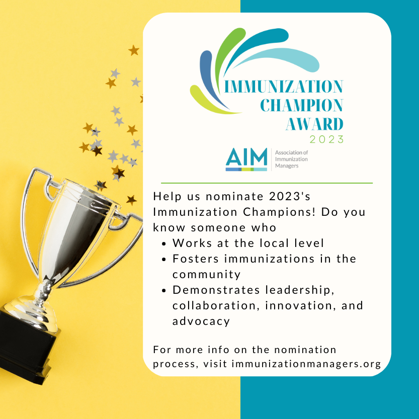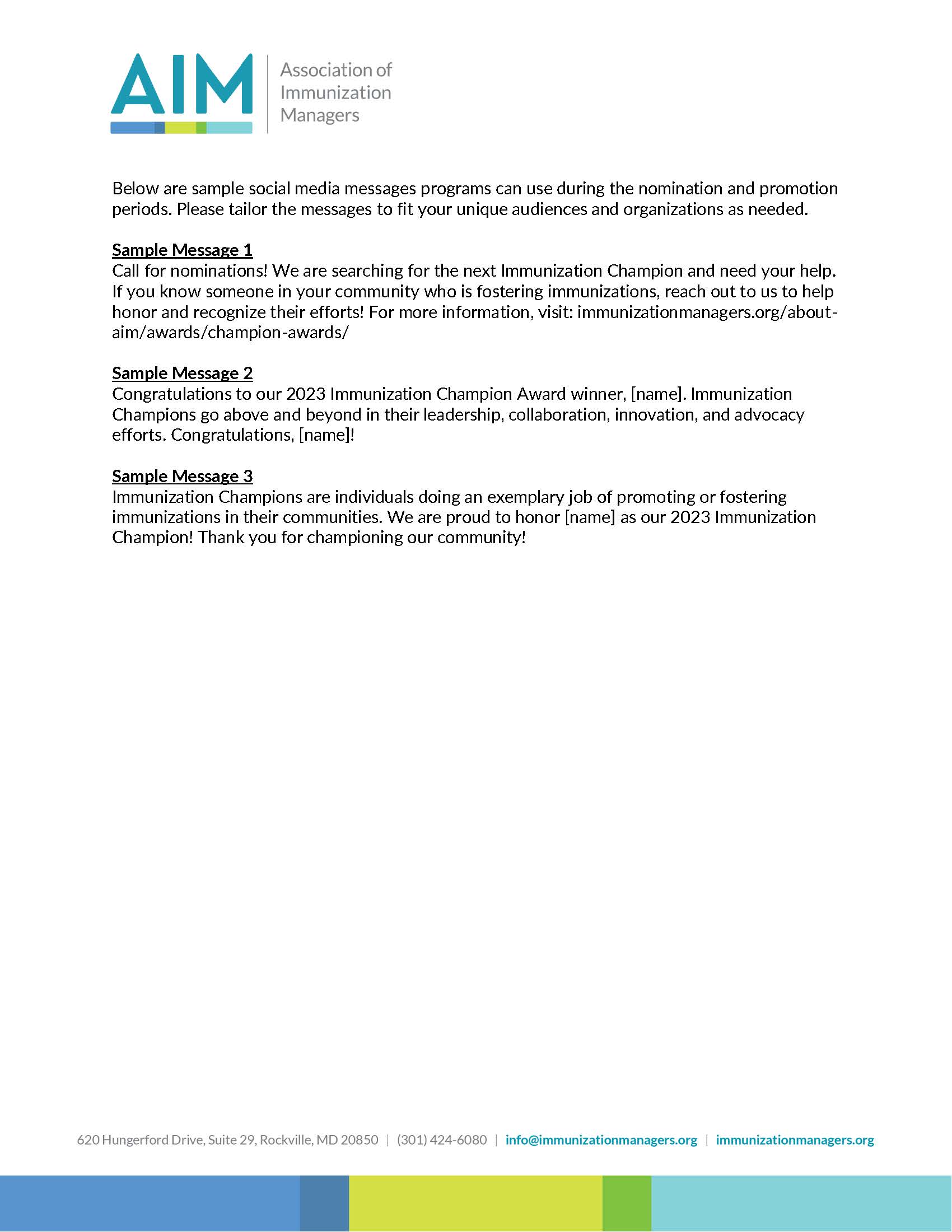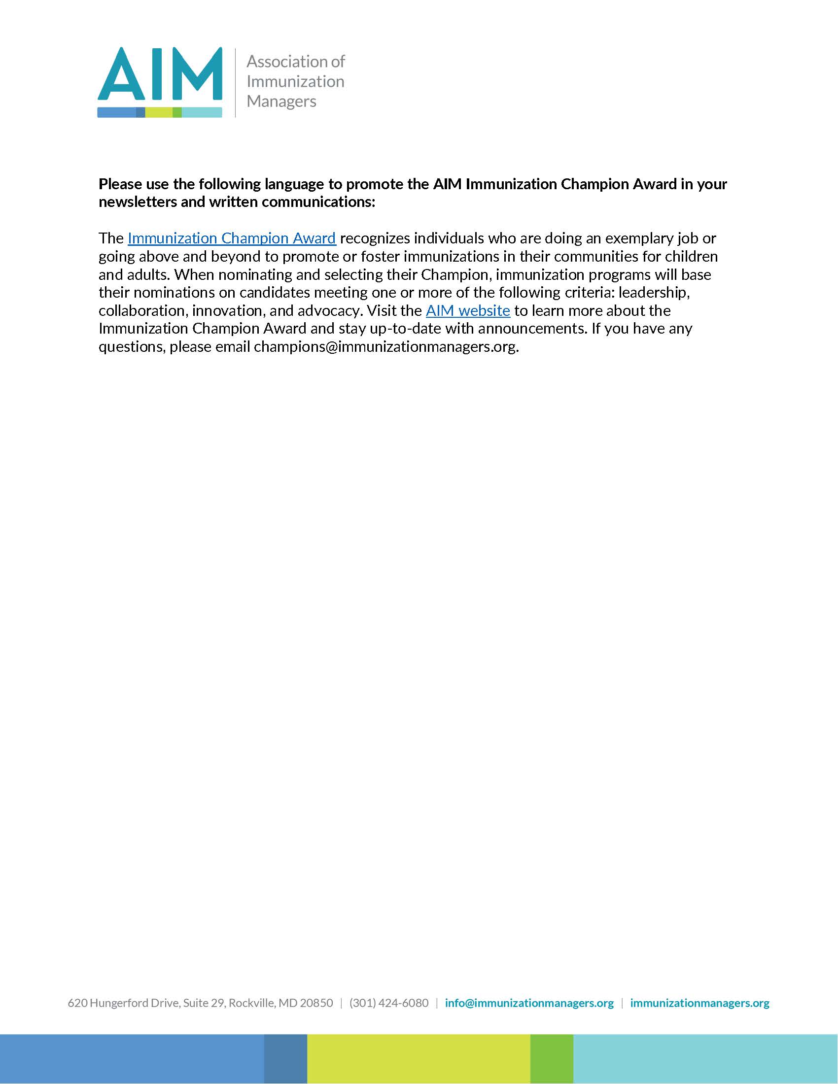 The sample language can be used to promote the AIM Immunization Champion Award in your newsletters and written communications.