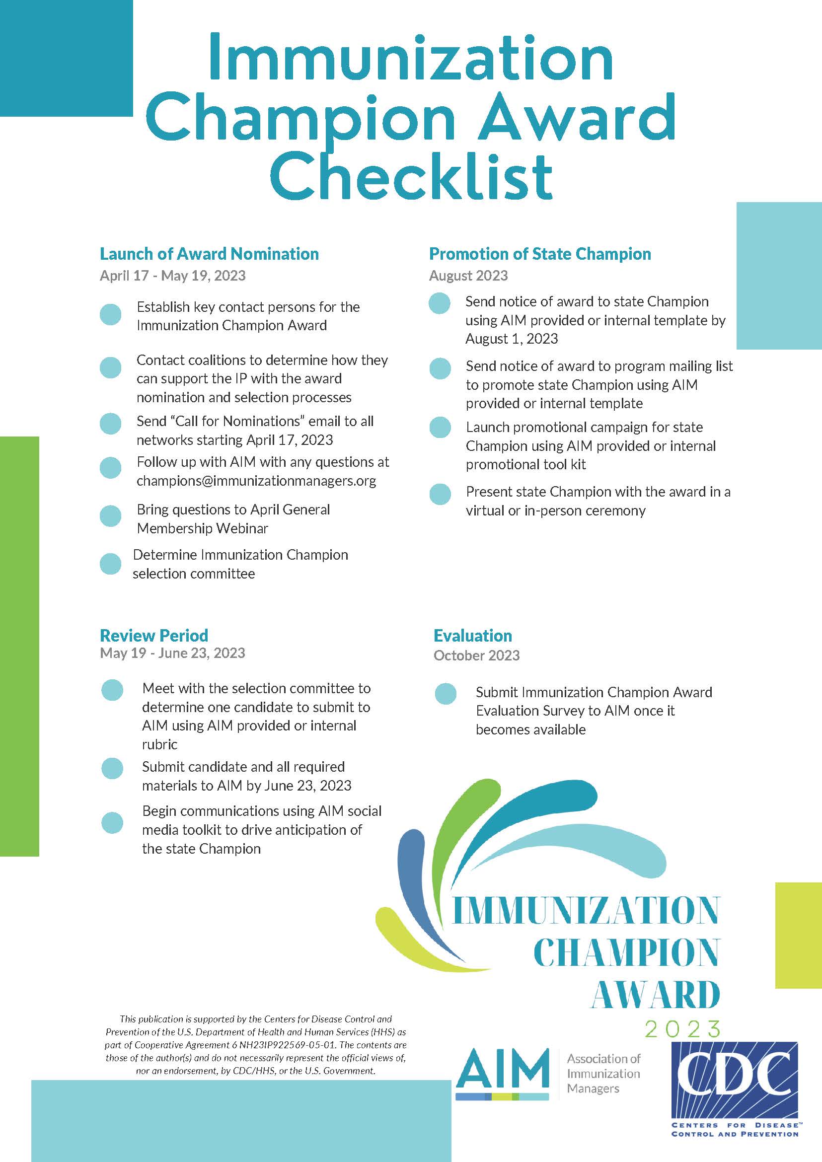 This checklist details each step of the Immunization Champion process, from the launch of nomination through evaluation.
