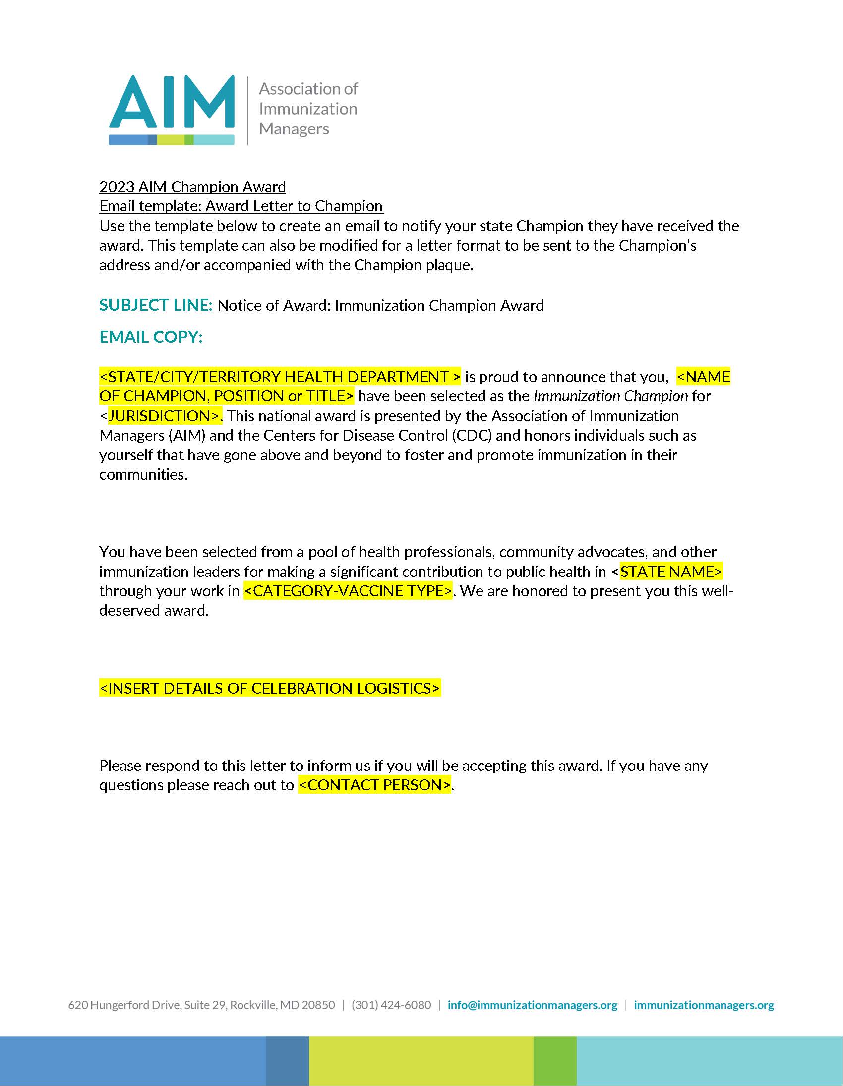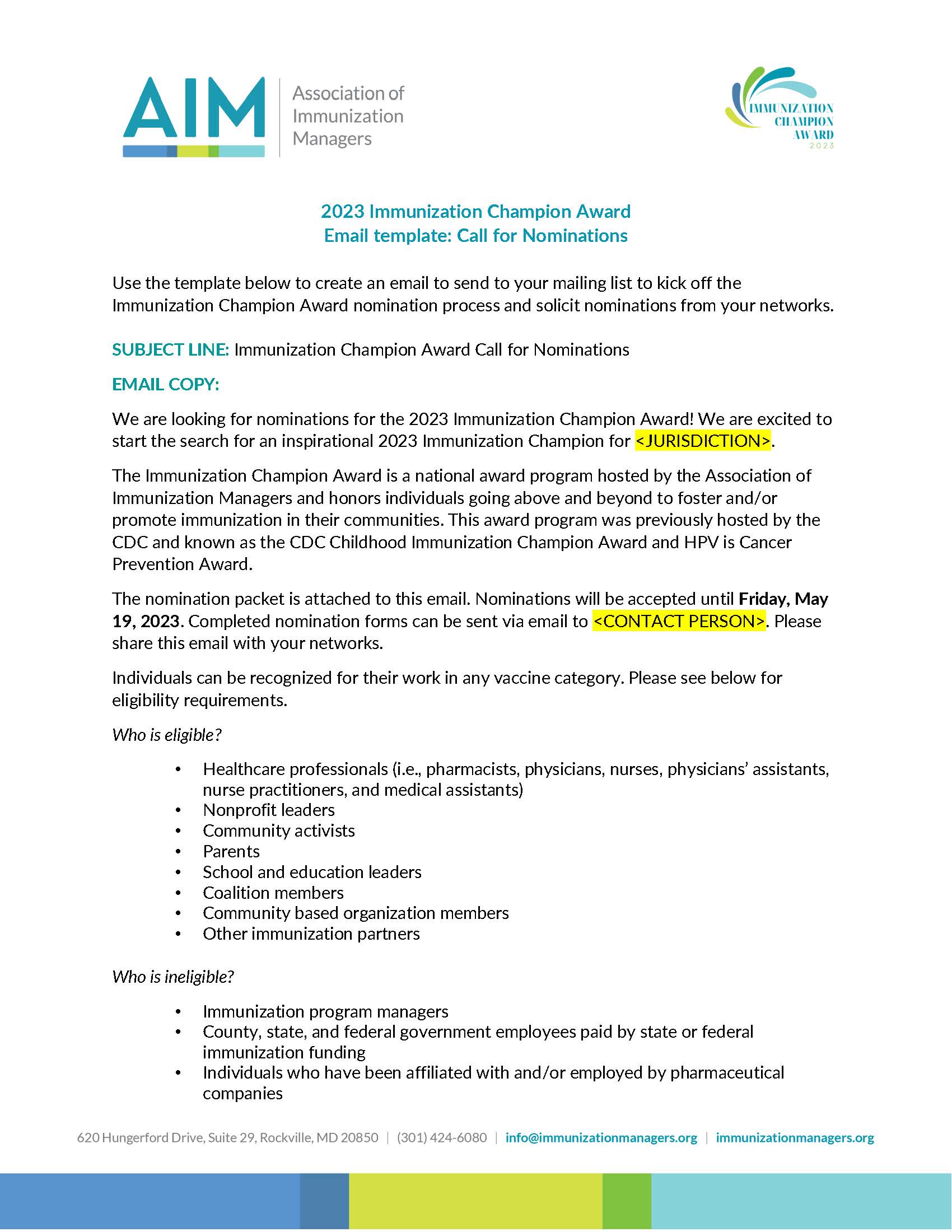This template can assist in creating an email to send to your mailing list to kick off the Immunization Champion Award nomination process and solicit nominations from your networks.