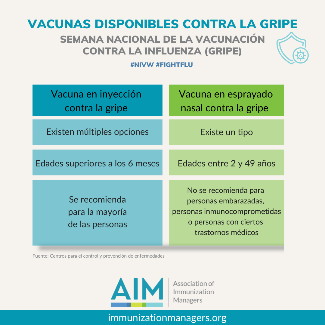 - Esta Semana Nacional de Vacunación contra la Gripe, ¡protégete! ¿Sabías que puedes elegir una vacuna nasal en aerosol, en lugar de una inyección? Una vacuna nasal en aerosol contra la gripe puede ser una opción para ciertas personas entre 2 y 49 años de edad. Asegúrate de preguntarle a tu médico si eres candidato para recibir este tipo de vacuna. Ya sea en inyección o nasal en aerosol, es fundamental que todas las personas mayores de 6 meses reciban esta protección. ¡Haz un plan y vacúnate hoy mismo! #NIVW #flu #FightFlu #CombateLaInfluenza