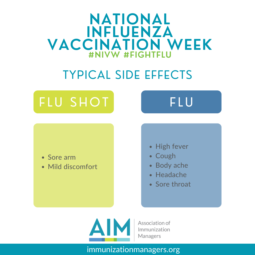 - The flu shot does not contain the live flu virus and cannot make you sick. Vaccine side effects like a sore arm or mild discomfort are common and usually go away within a few days. Join us in fighting the flu this year by scheduling your vaccination during National Influenza Vaccination Week! #NIVW #FightFlu