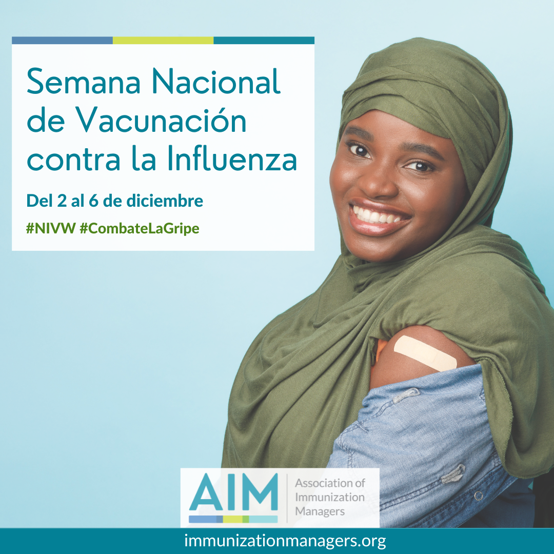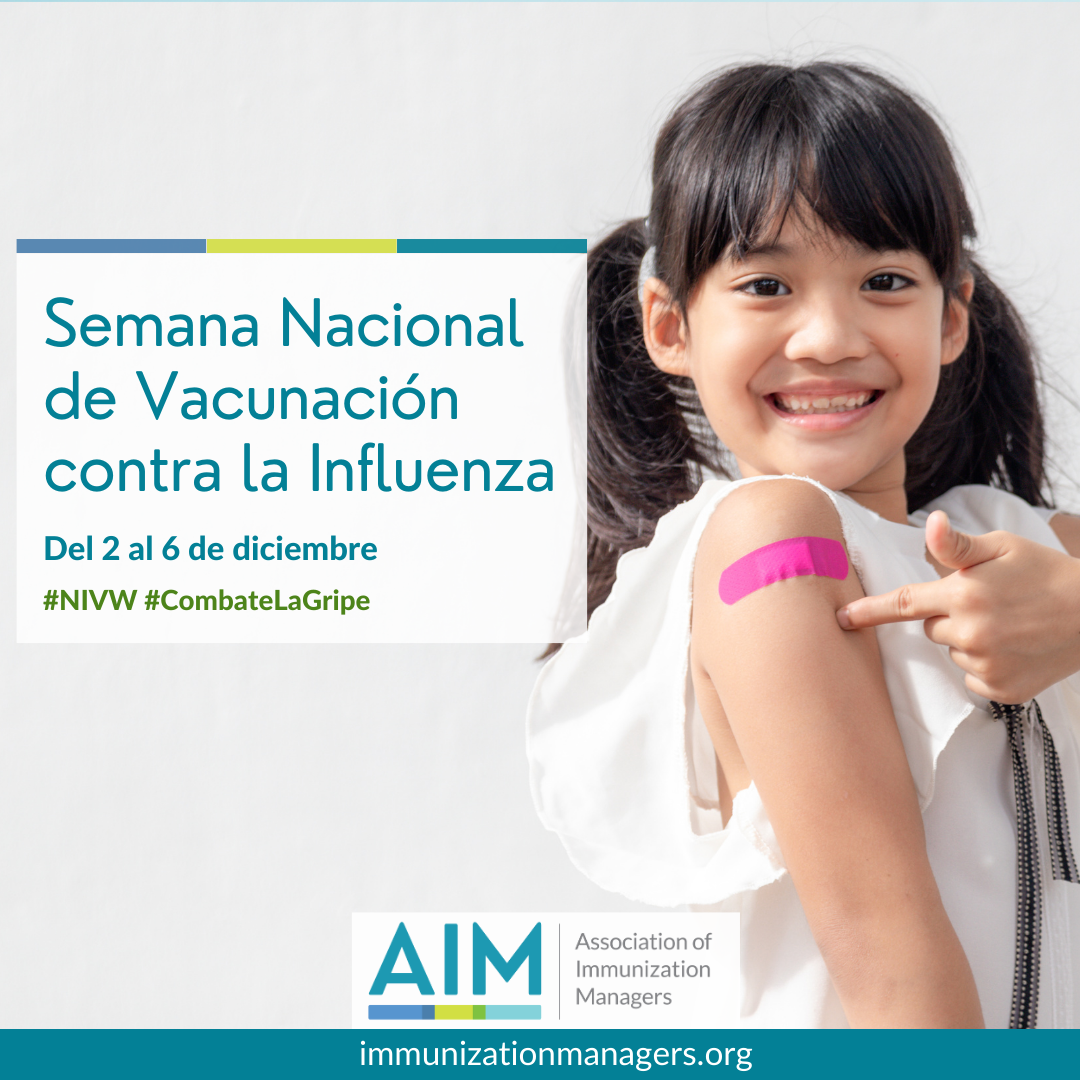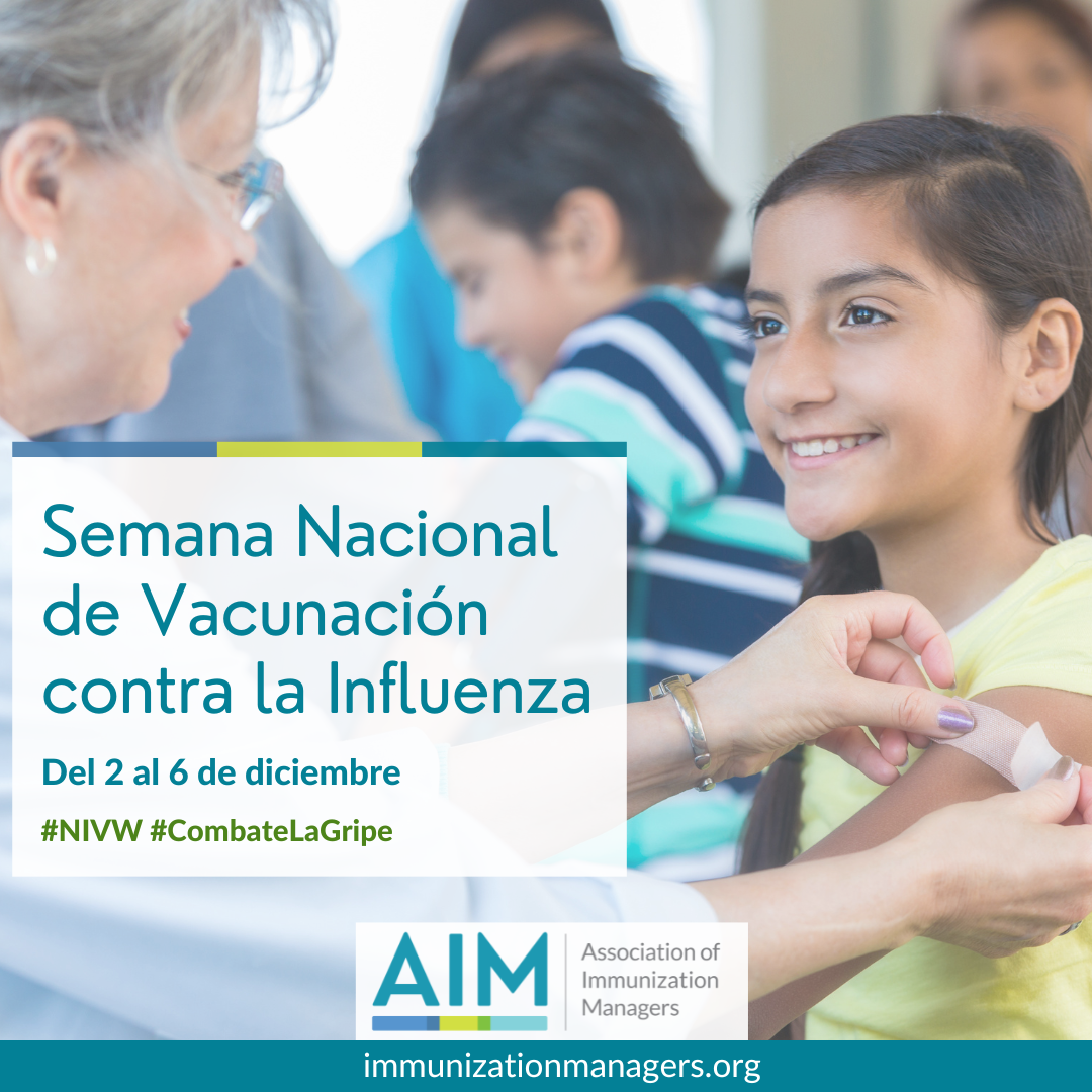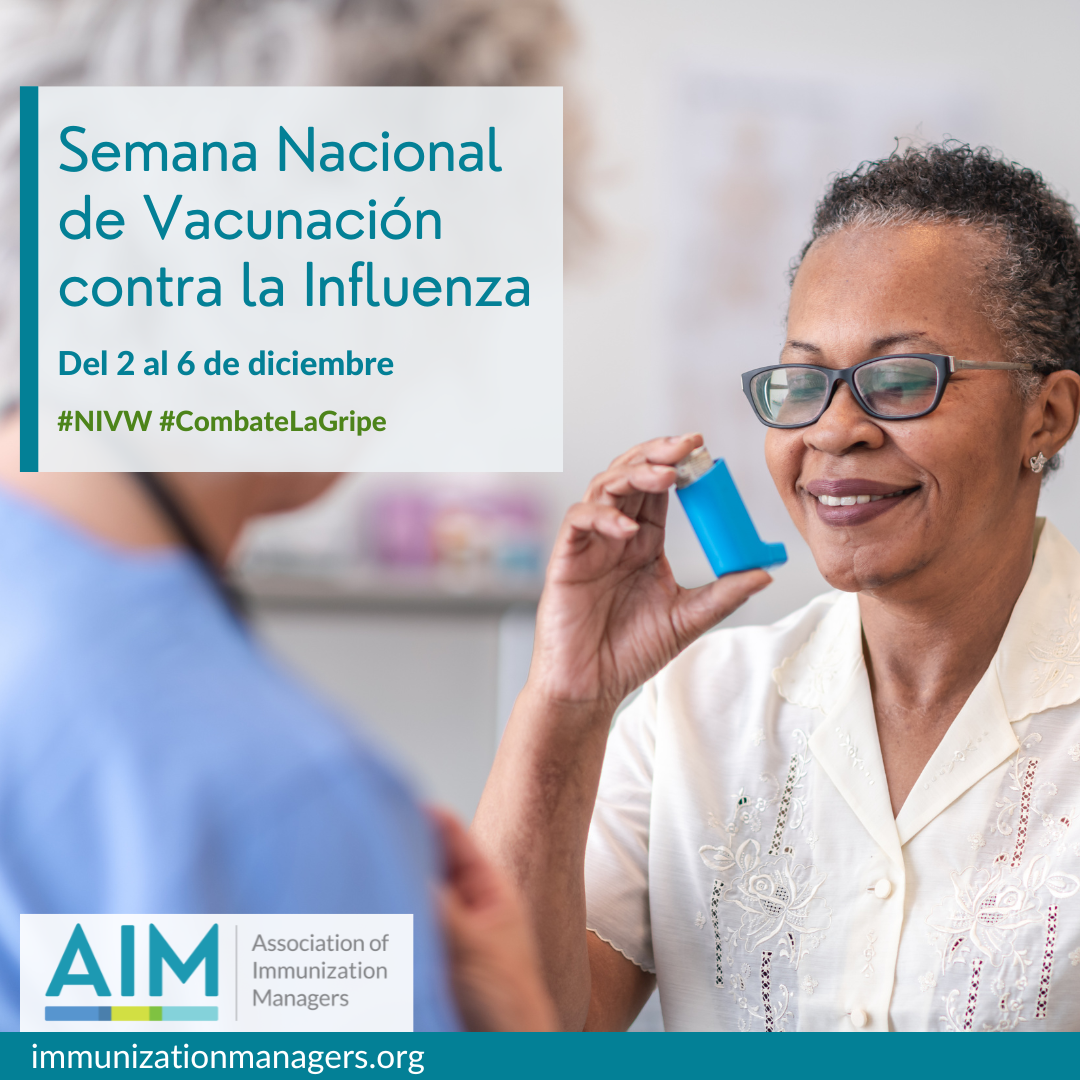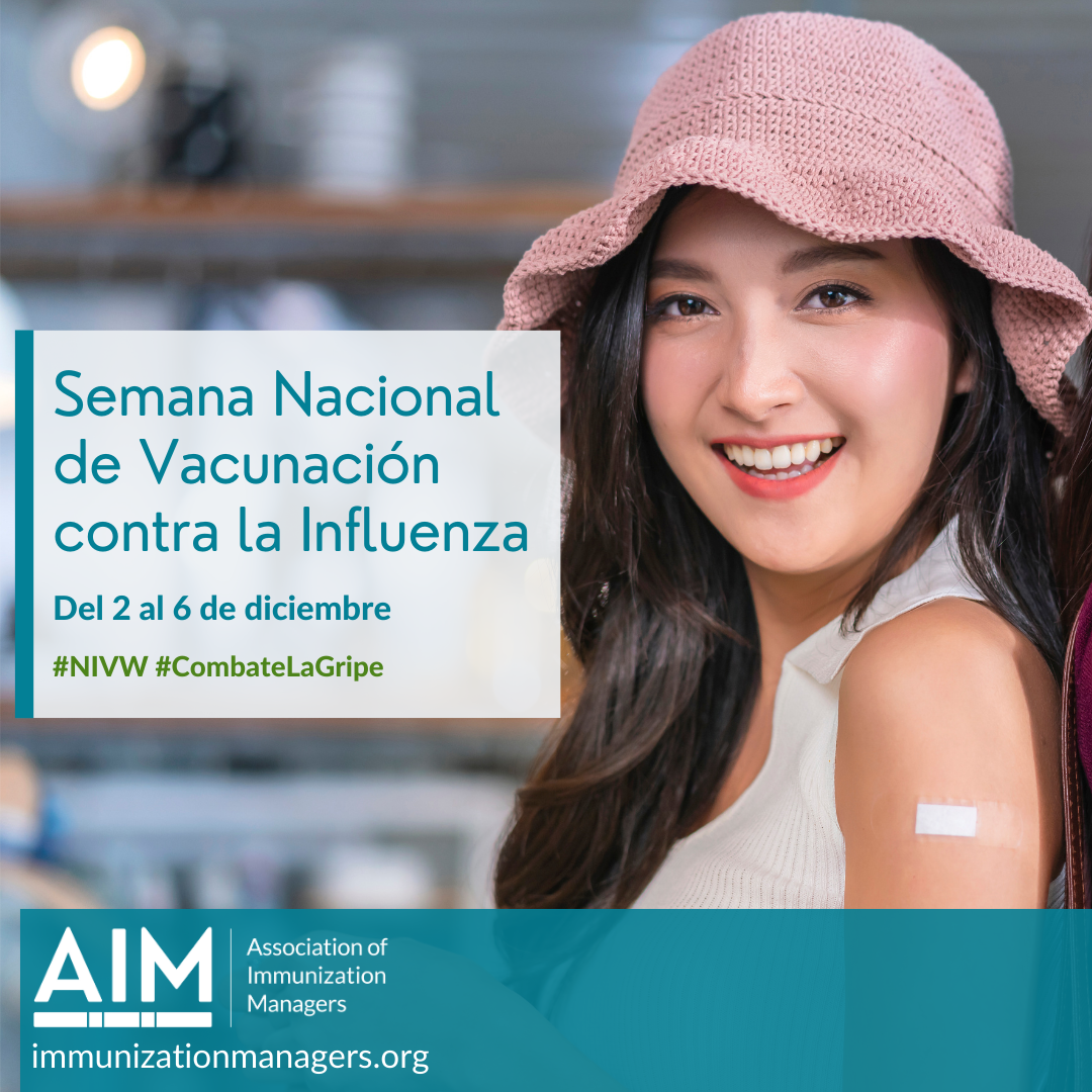 ¡Del 2 al 6 de diciembre, únase a AIM para crear conciencia sobre la Semana Nacional de Vacunación contra la Influenza, #NIVW! Los CDC organizan anualmente esta semana para recordar a todas las personas mayores de 6 meses que todavía hay tiempo de vacunarse contra la gripe. La vacuna contra la gripe es la mejor forma de protegernos de una enfermedad gripal grave que puede causar hospitalización e incluso la muerte.