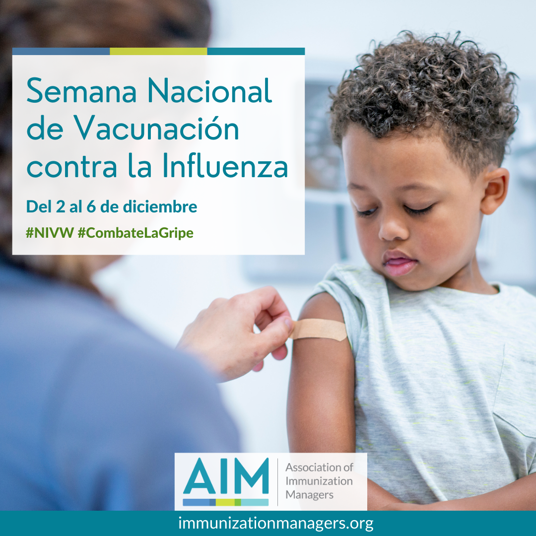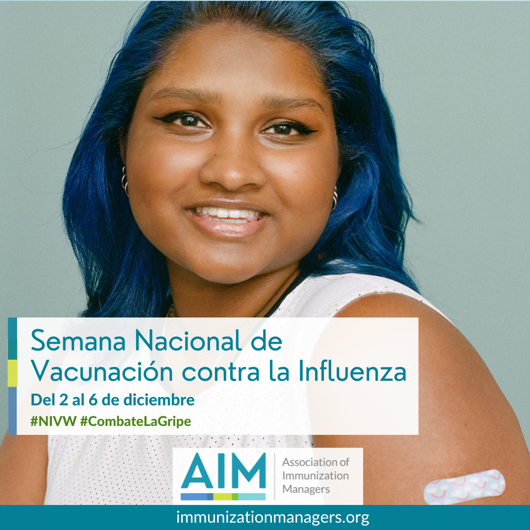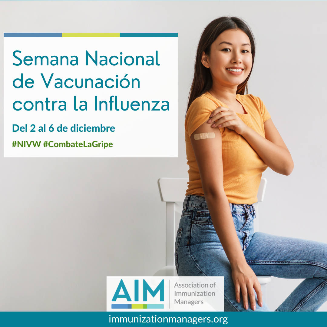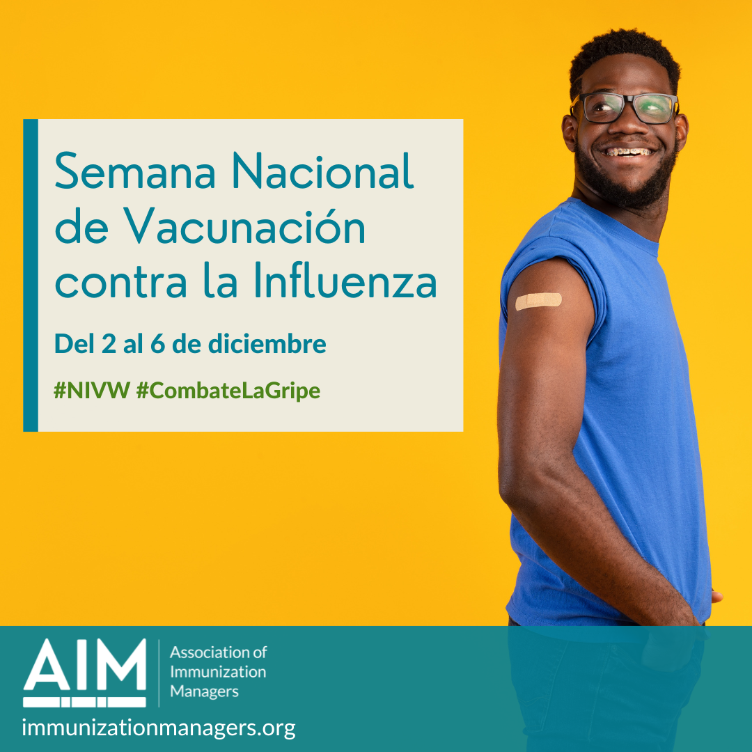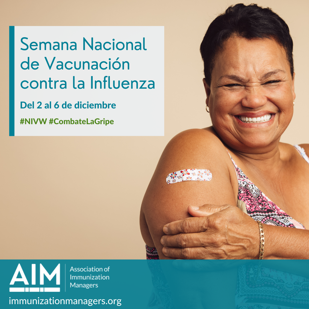 ¡Del 2 al 6 de diciembre, únase a AIM para crear conciencia sobre la Semana Nacional de Vacunación contra la Influenza, #NIVW! Los CDC organizan anualmente esta semana para recordar a todas las personas mayores de 6 meses que todavía hay tiempo de vacunarse contra la gripe. La vacuna contra la gripe es la mejor forma de protegernos de una enfermedad gripal grave que puede causar hospitalización e incluso la muerte.