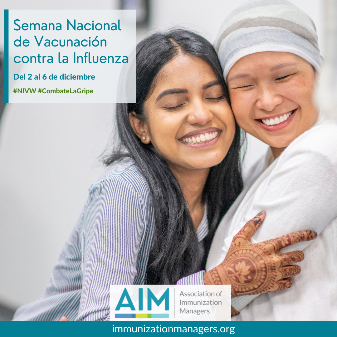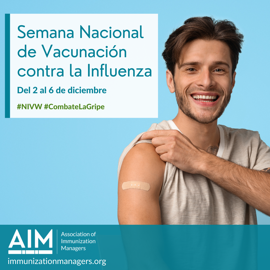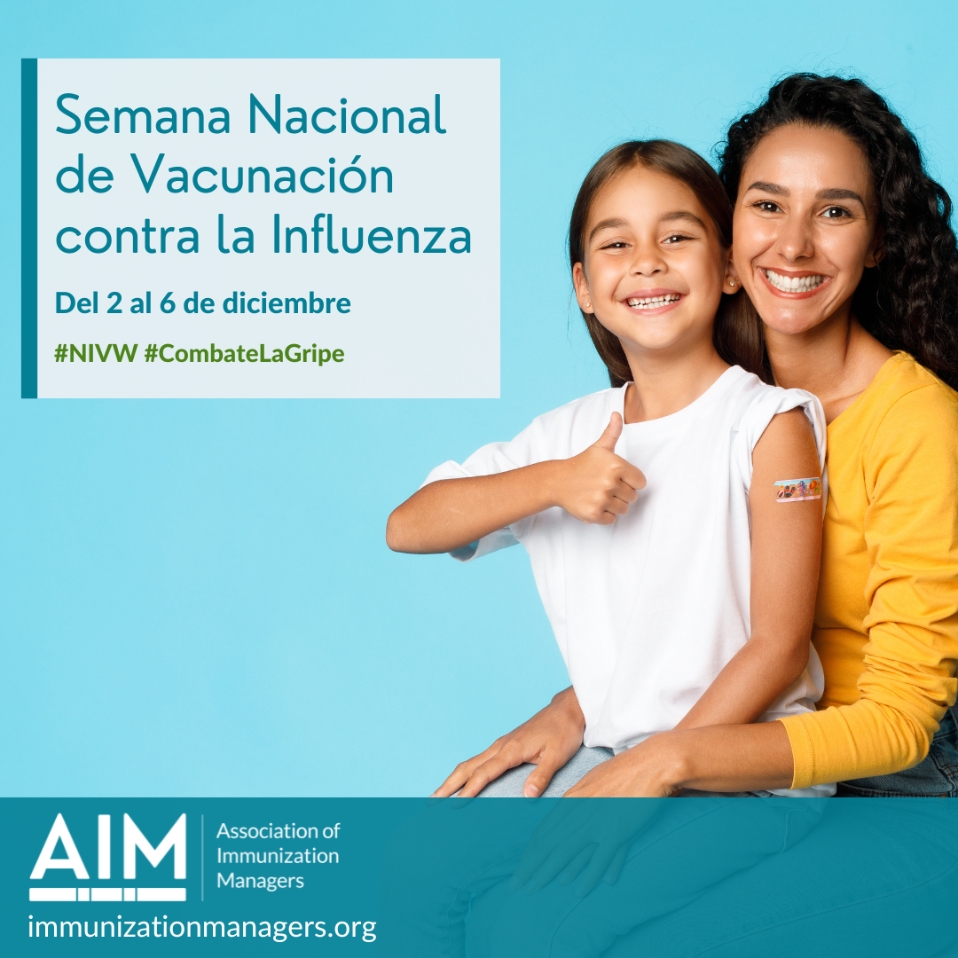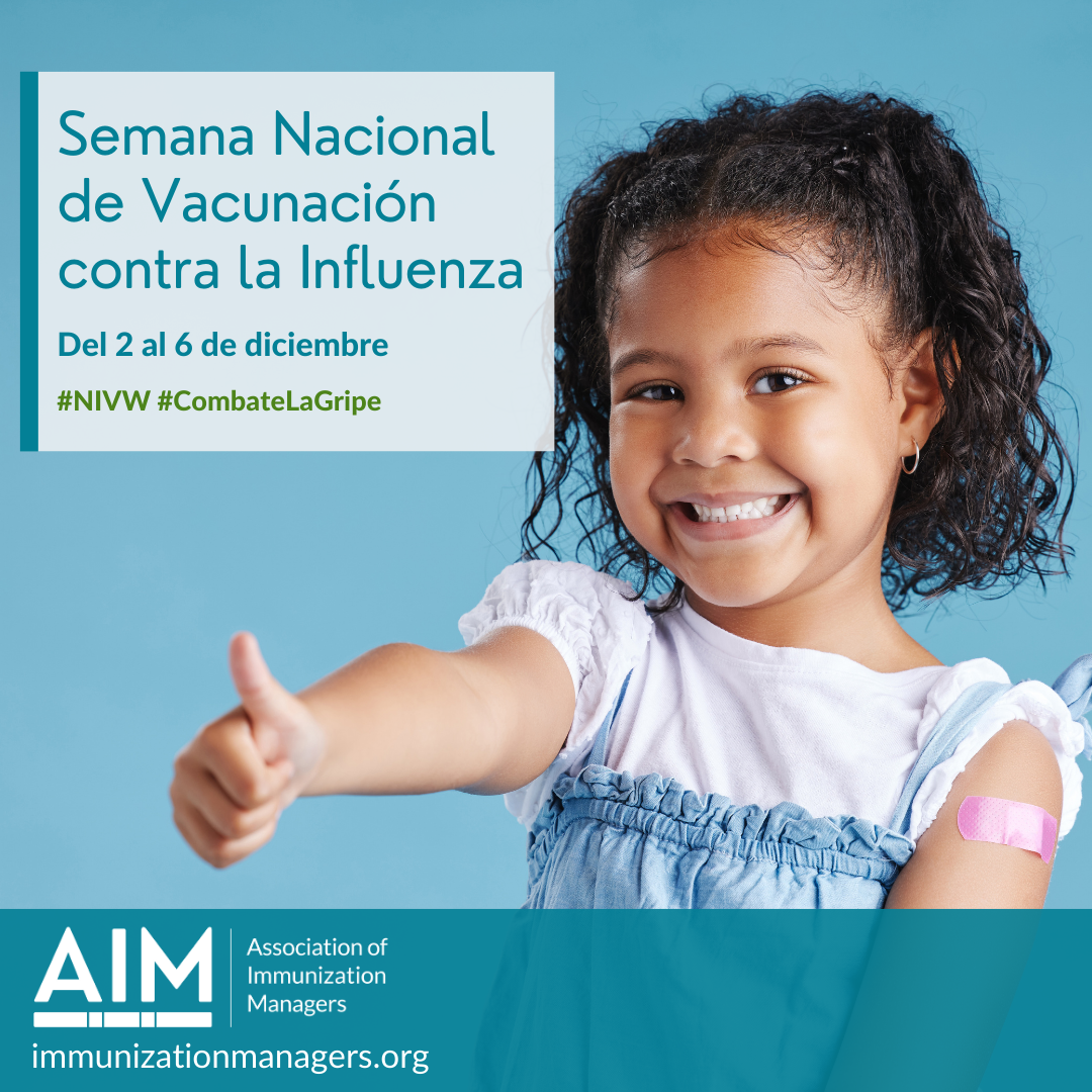 ¡Del 2 al 6 de diciembre, únase a AIM para crear conciencia sobre la Semana Nacional de Vacunación contra la Influenza, #NIVW! Los CDC organizan anualmente esta semana para recordar a todas las personas mayores de 6 meses que todavía hay tiempo de vacunarse contra la gripe. La vacuna contra la gripe es la mejor forma de protegernos de una enfermedad gripal grave que puede causar hospitalización e incluso la muerte.