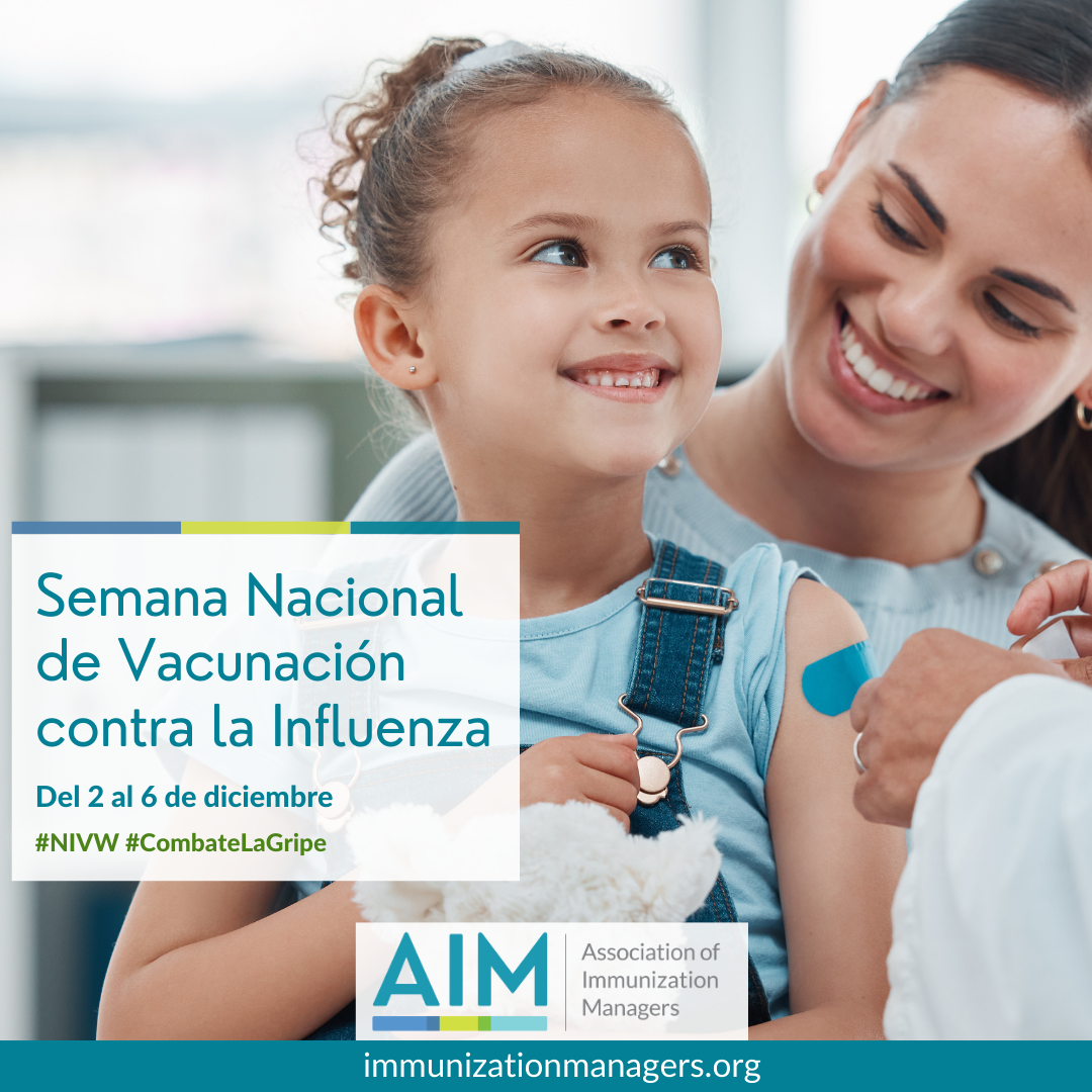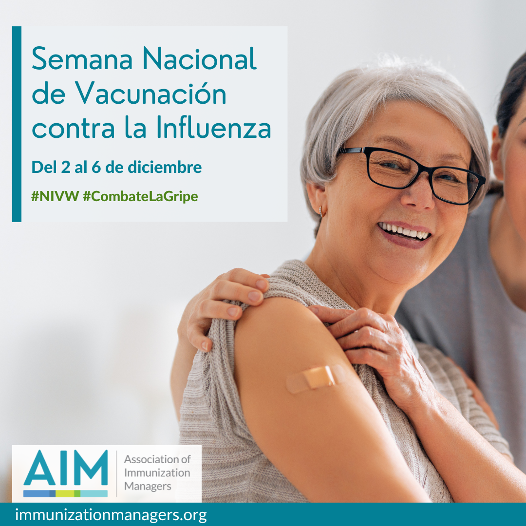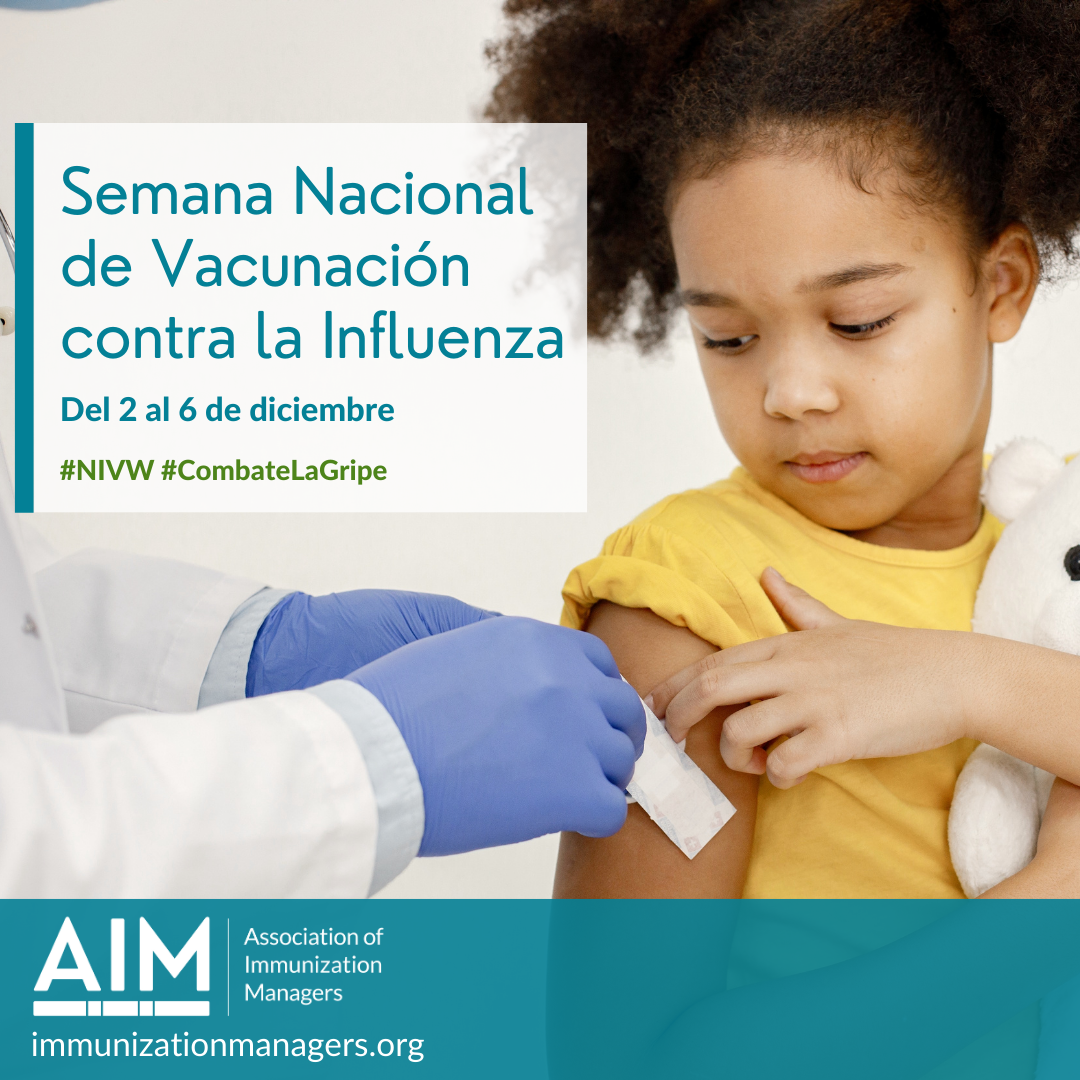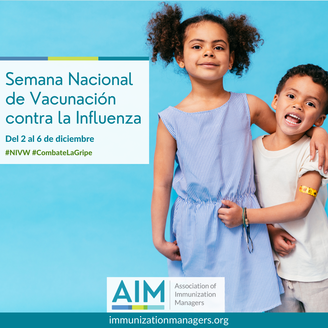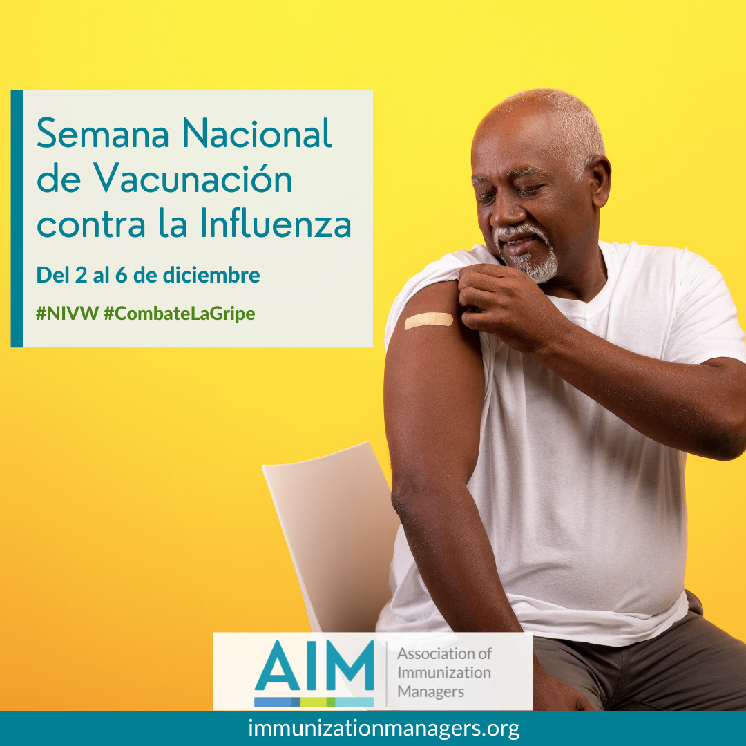 ¡Del 2 al 6 de diciembre, únase a AIM para crear conciencia sobre la Semana Nacional de Vacunación contra la Influenza, #NIVW! Los CDC organizan anualmente esta semana para recordar a todas las personas mayores de 6 meses que todavía hay tiempo de vacunarse contra la gripe. La vacuna contra la gripe es la mejor forma de protegernos de una enfermedad gripal grave que puede causar hospitalización e incluso la muerte.