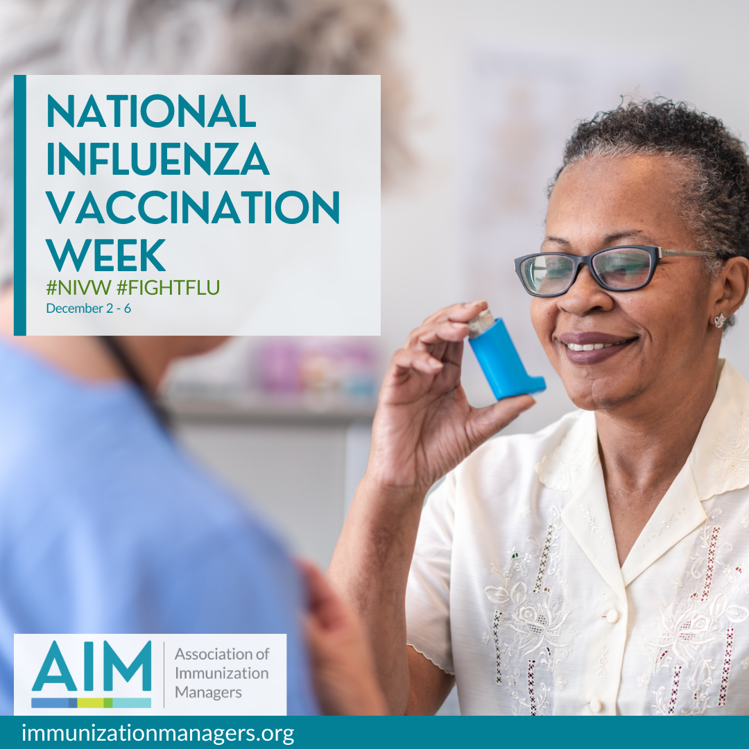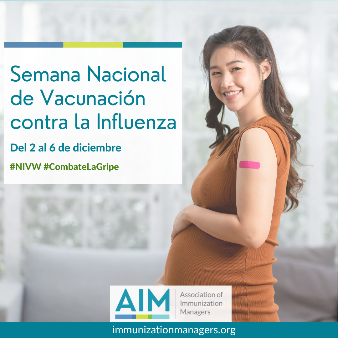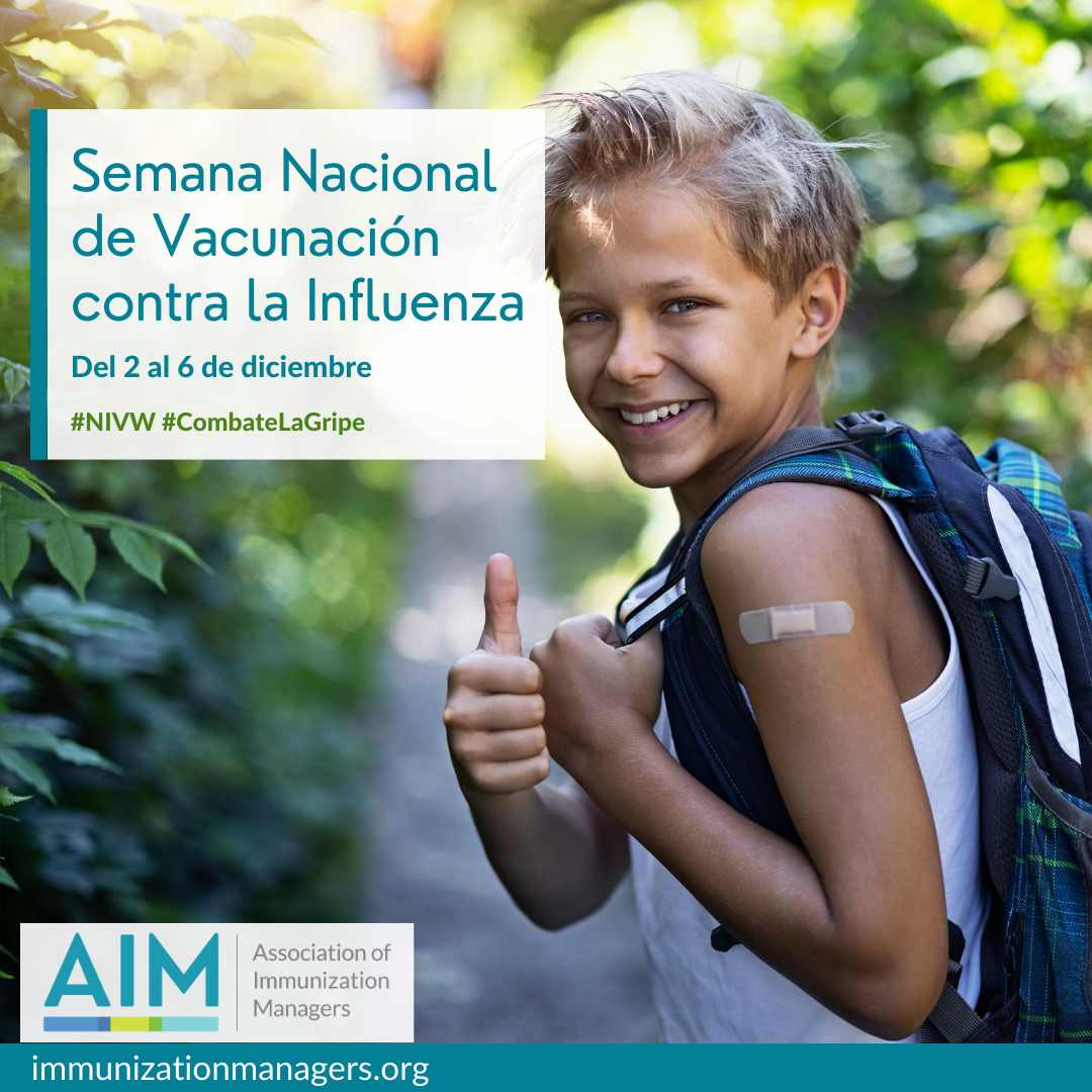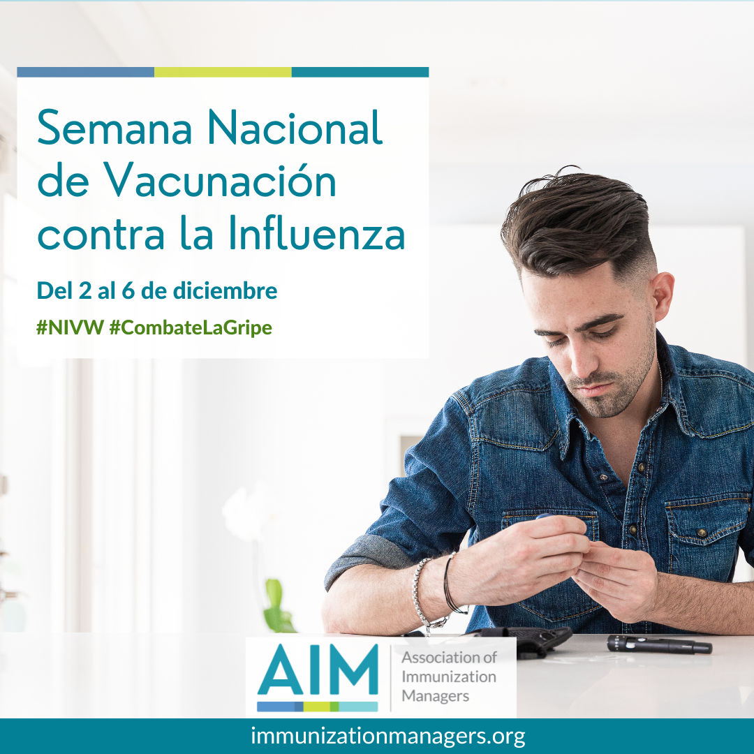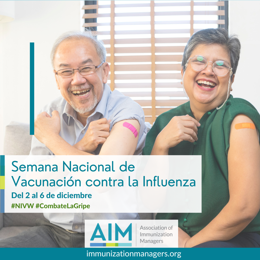 ¡Del 2 al 6 de diciembre, únase a AIM para crear conciencia sobre la Semana Nacional de Vacunación contra la Influenza, #NIVW! Los CDC organizan anualmente esta semana para recordar a todas las personas mayores de 6 meses que todavía hay tiempo de vacunarse contra la gripe. La vacuna contra la gripe es la mejor forma de protegernos de una enfermedad gripal grave que puede causar hospitalización e incluso la muerte.