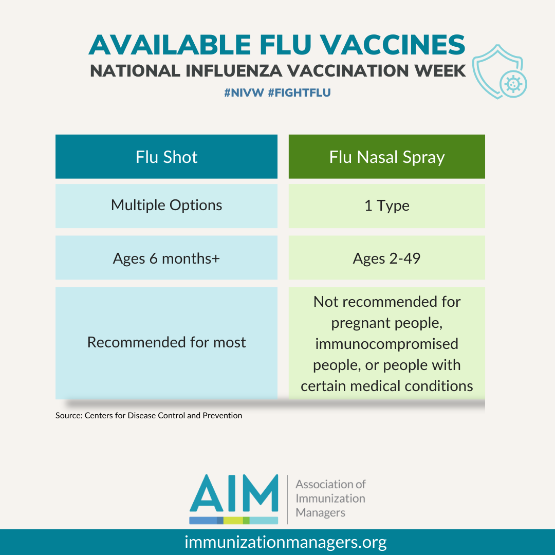 - This National Influenza Vaccination Week, protect yourself against the flu. Did you know that you may be able to choose a nasal spray vaccine instead of a shot? A nasal spray flu vaccine may be an option for certain people 2-49 years old; be sure to ask your doctor if you qualify. Whether it’s the flu shot or nasal spray, it’s critical that everyone 6 months and older receive the flu vaccine. Make a plan and get your vaccination today! #NIVW #flu #FightFlu