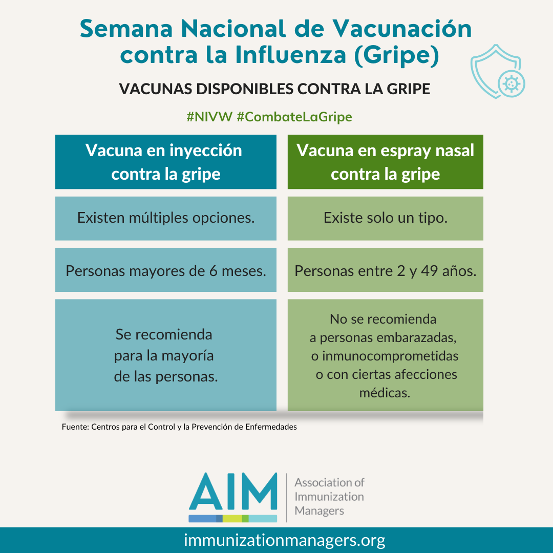 - Esta Semana Nacional de Vacunación contra la Gripe, ¡protégete! ¿Sabías que puedes elegir una vacuna nasal en aerosol, en lugar de una inyección? Una vacuna nasal en aerosol contra la gripe puede ser una opción para ciertas personas entre 2 y 49 años de edad. Asegúrate de preguntarle a tu médico si eres candidato para recibir este tipo de vacuna. Ya sea en inyección o nasal en aerosol, es fundamental que todas las personas mayores de 6 meses reciban esta protección. ¡Haz un plan y vacúnate hoy mismo! #NIVW #flu #FightFlu #CombateLaInfluenza