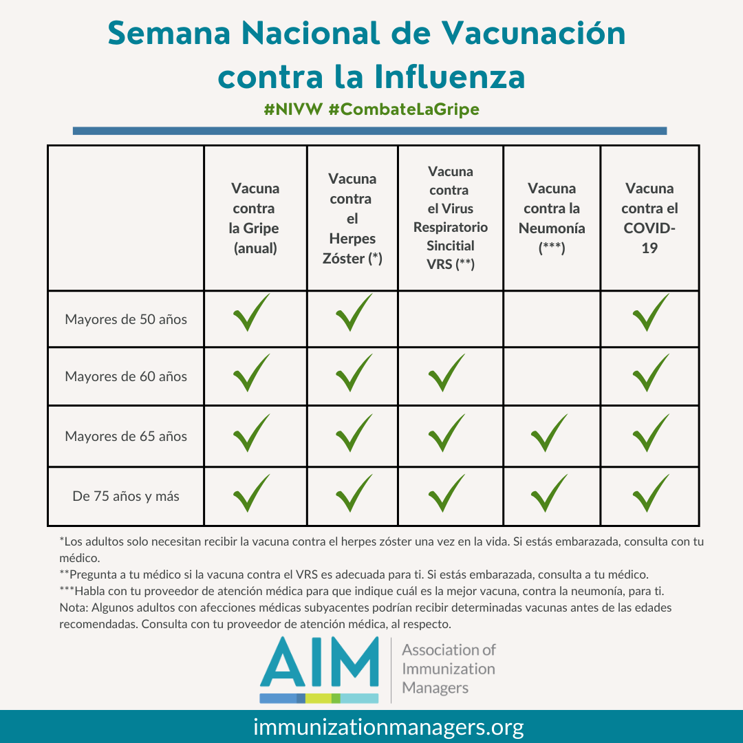 - ¿Sabías que, si tienes más de 50 años, puedes recibir la vacuna contra la gripe al mismo tiempo que otras vacunas, incluidas las que te protegen del COVID-19, el herpes zóster, el VSR y la neumonía? Esta Semana Nacional de Vacunación contra la Influenza, ahorra tiempo programando todas tus vacunas en la misma cita. Si tienes dudas, consulta con tu proveedor de atención médica. #CombateLaGripe #NIVW