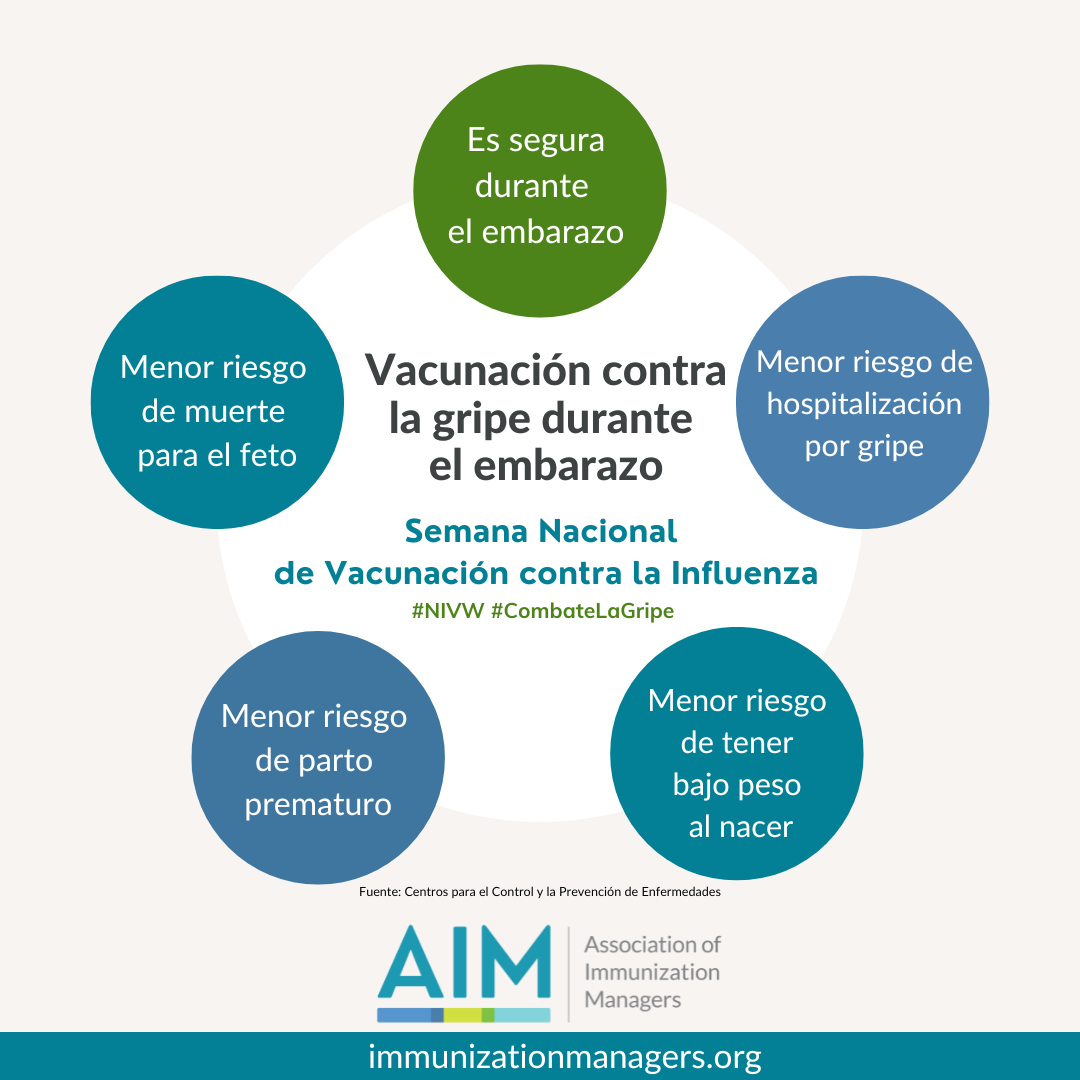 - ¿Estás embarazada? La Semana Nacional de Vacunación contra la Influenza es una excelente oportunidad para recibir tu vacuna contra la gripe. La vacuna contra la gripe protege a la persona embarazada y a su bebé. Las vacunas contra la influenza son seguras para las personas embarazadas y durante el periodo posparto; también ayudan a mantener saludables a sus familias. Encuentra más información en el sitio web de los CDC. #NIVW #CombateLaGripe