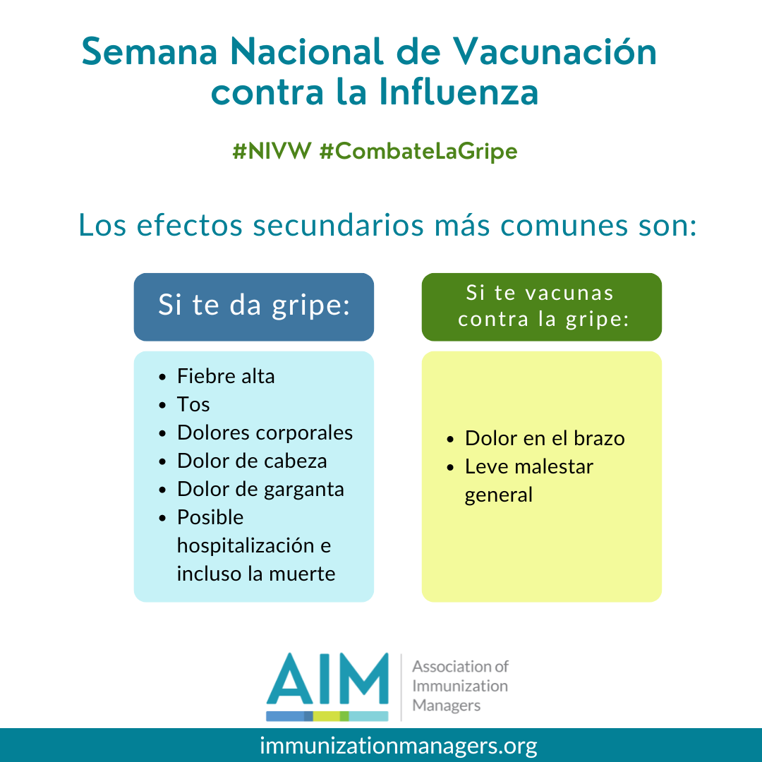 - La #vacuna contra la #gripe no contiene el virus vivo de la gripe y no puede enfermarte. Cualquier efecto secundario al vacunarte es menor en comparación con la incomodidad de tener gripe. ¡Únete a la lucha contra la gripe este año programando tu vacuna en la Semana Nacional de Vacunación contra la Influenza! #NIVW #CombateLaGripe