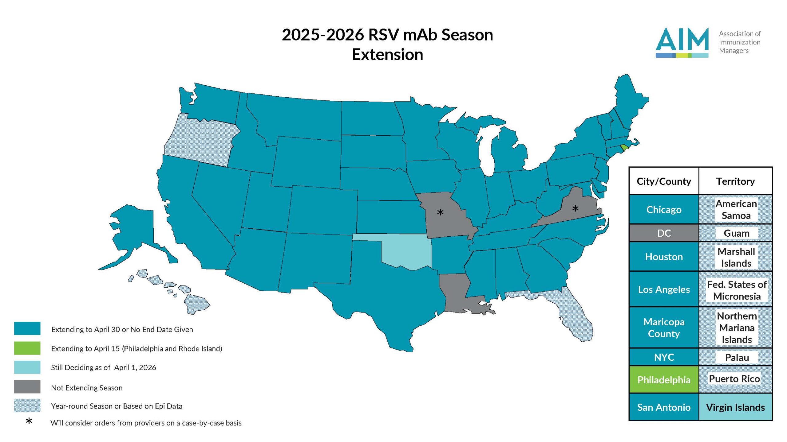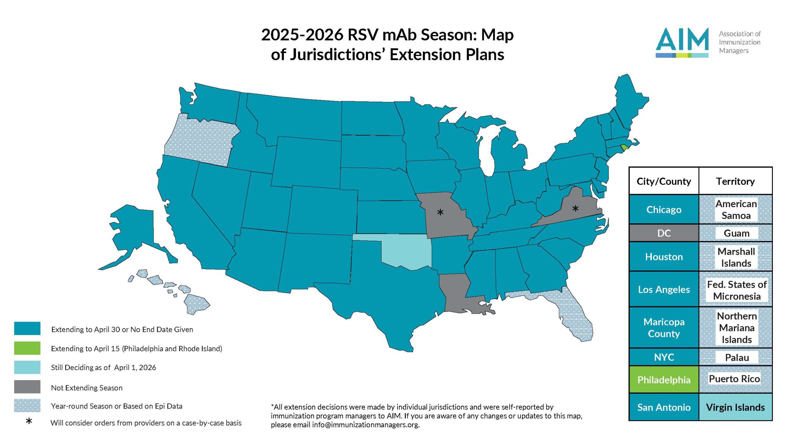 The AIM RSV Season Extension Map provides a national snapshot of how the 66 federally funded immunization programs are responding to ongoing virus circulation. Developed by AIM, the map visually highlights which jurisdictions have chosen to extend their RSV immunization season, offering a clear and timely view of immunization program decisions across the United States, federally funded cities, and U.S territories.