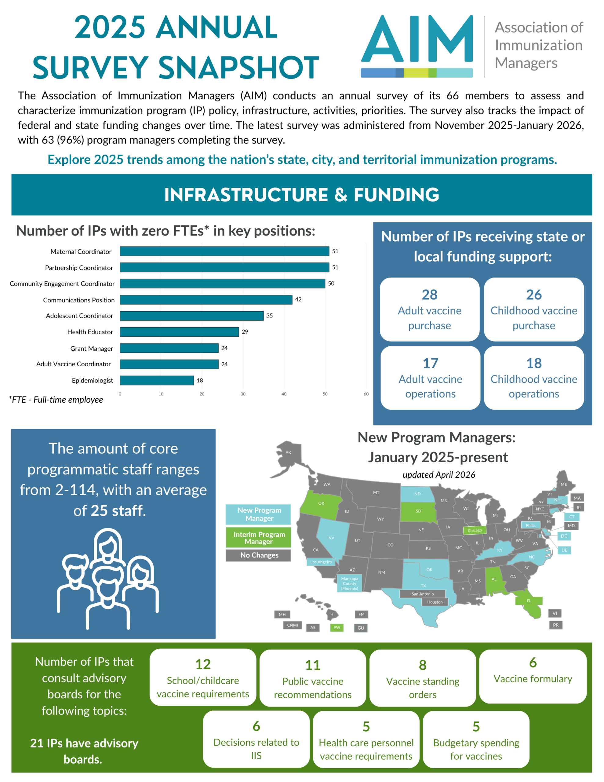 The 2025 AIM Annual Survey Snapshot is a high-level overview of the results of the 2025 Annual Survey. The snapshot contains easy-to-read data about the immunization environment, current challenges, and more. Immunization program (IP) infrastructure and funding, priorities, and activities are highlighted visually.