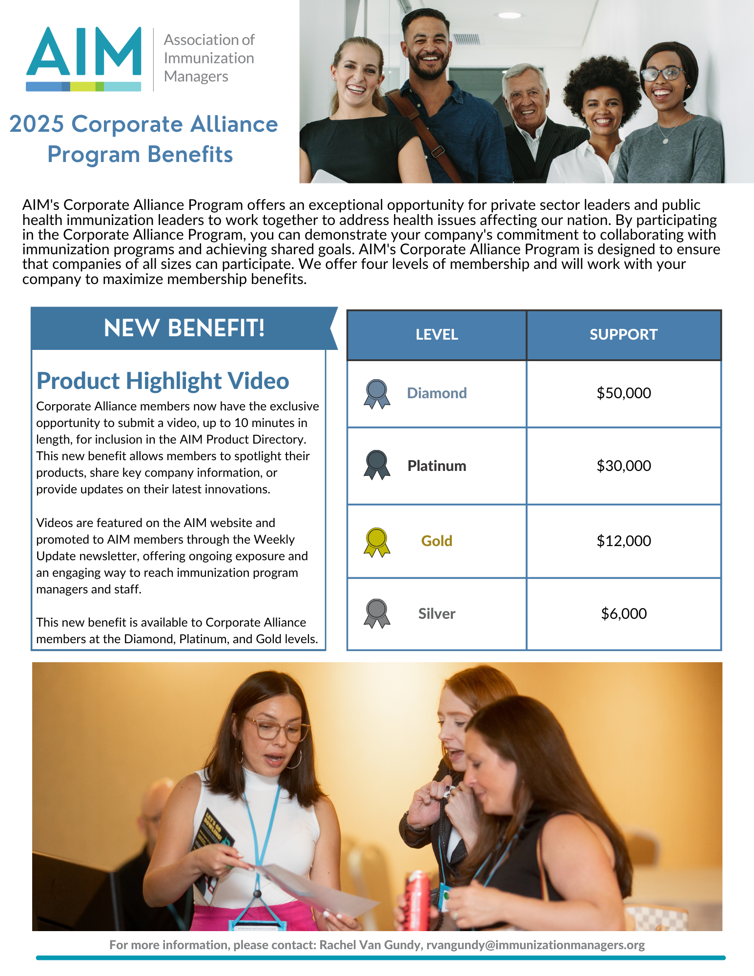 AIM’s Corporate Alliance Program offers an exceptional opportunity for private sector leaders and public health immunization leaders to work together to address health issues affecting our nation. By participating in the Corporate Alliance Program, you can demonstrate your company’s commitment to collaborating with immunization programs and achieving shared goals. AIM’s Corporate Alliance Program is designed to ensure that companies of all sizes can participate. We offer four levels of membership and will work with your company to maximize membership benefits. View the 2025 brochure to read about program updates and benefits.
