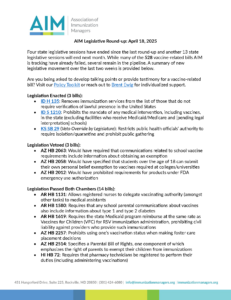 Four state legislative sessions have ended since the last round-up and another 13 state legislative sessions will end next While many of the 528 vaccine-related bills AIM is tracking have already failed, several remain in the pipeline. A summary of the new legislative movement over the last two weeks is provided in the PDF.