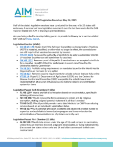 Half of the state’s legislative sessions have concluded for the year, with 25 states still underway. A summary of new legislative movement over the last two weeks for the 545 vaccine-related bills AIM is tracking is provided in the PDF.