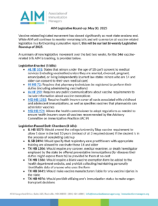 Vaccine-related legislated movement has slowed significantly as most state sessions come to an end. While AIM will continue to monitor remaining bills and will summarize all vaccine-related legislation in a forthcoming cumulative report, this is the last bi-weekly Legislative Roundup of 2025. A summary of new legislative movement over the last two weeks for the 546 vaccine-related bills AIM is tracking is provided in the PDF.