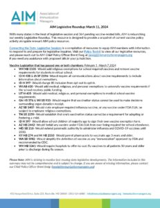 With many states in the heat of legislative session and 364 pending vaccine-related bills, AIM is relaunching our weekly Legislative Round-Up. This resource is designed to provide a snapshot of current vaccine policy activity alongside relevant AIM policy resources.