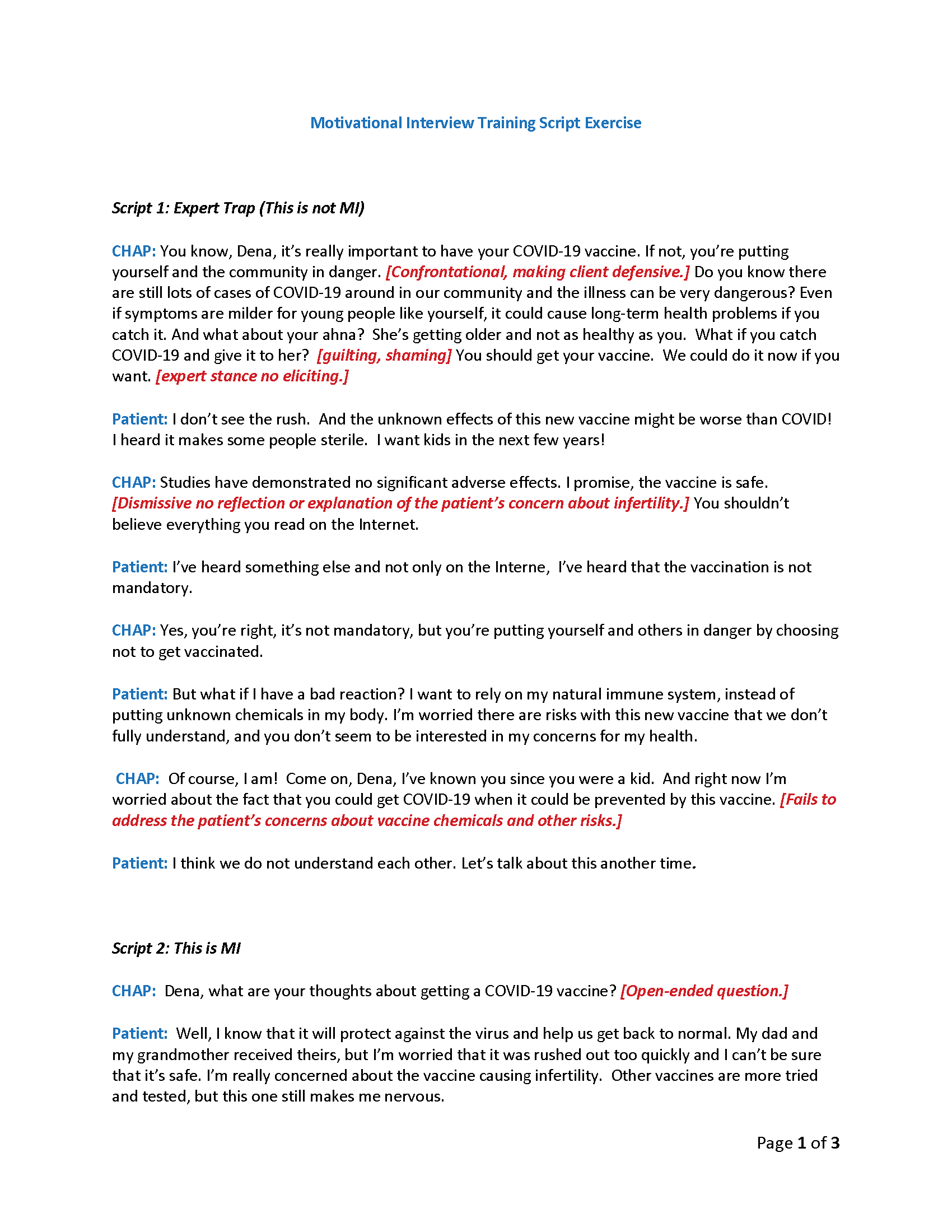 View a tool created by Alaska Native Tribal Health Consortium REACH partner, Alaska Native CHAP, to train their team in motivational interviewing. This resource provides a motivational interview script with mistakes to avoid, as well as an example of what a model motivational interview looks like. This may be a helpful internal resource for people working with communities to experience a “what not to do” conversation alongside the “best practices” example.