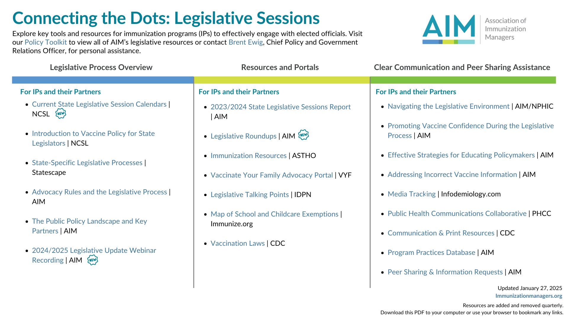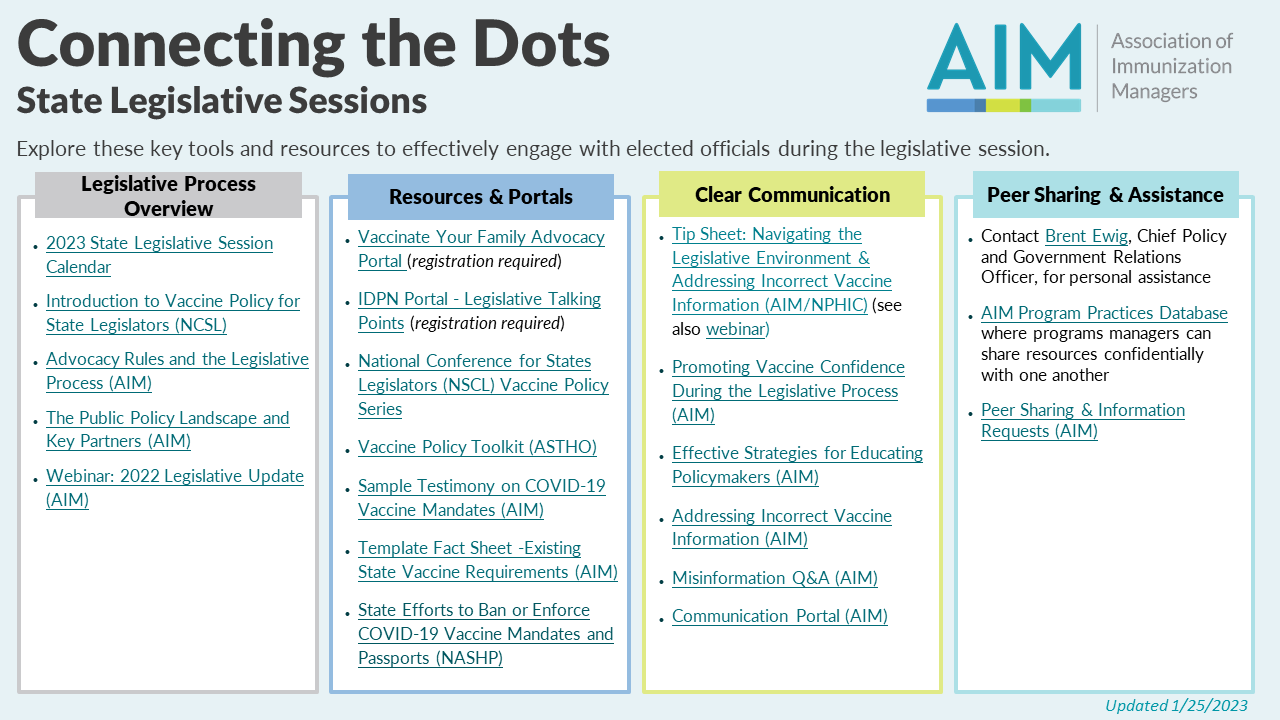 AIM’s Legislative Connecting the Dots is a continually updated resource that provides a consolidated place to find various information pertaining to state legislative systems, including legislative process overview, resources and portals, clear communication guidelines, and peer sharing and assistance. Please contact Brent Ewig for legislative questions and Rachel Van Gundy for any other questions or concerns.