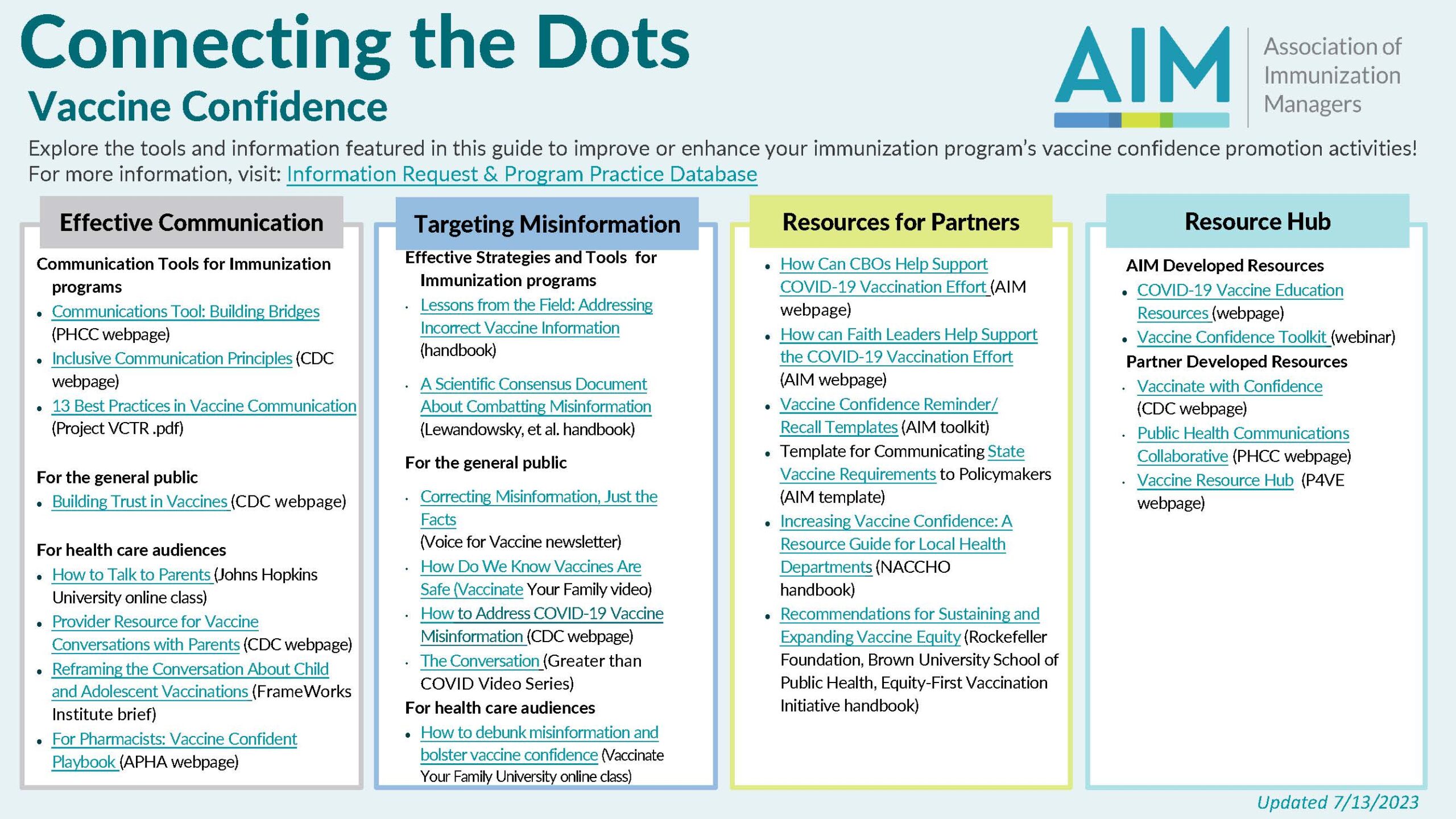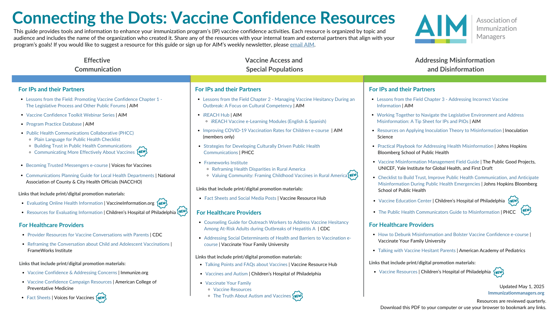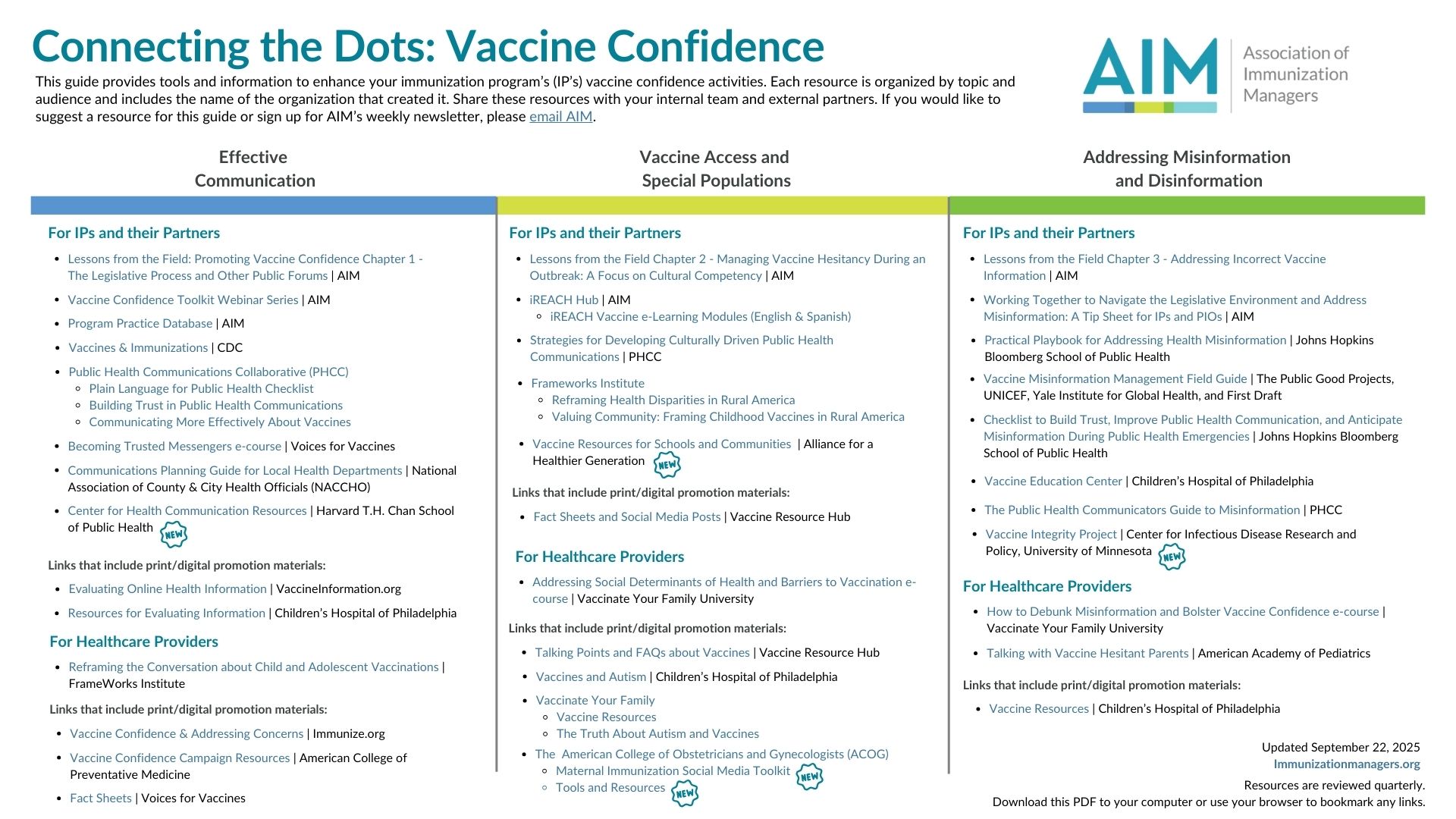 Connecting the Dots: Vaccine Confidence provides tools and information to enhance your immunization program’s (IP’s) vaccine confidence activities. Each resource is organized by topic and audience and includes the name of the organization who created it. Share any of the resources with your internal team and external partners that align with your program’s goals!
