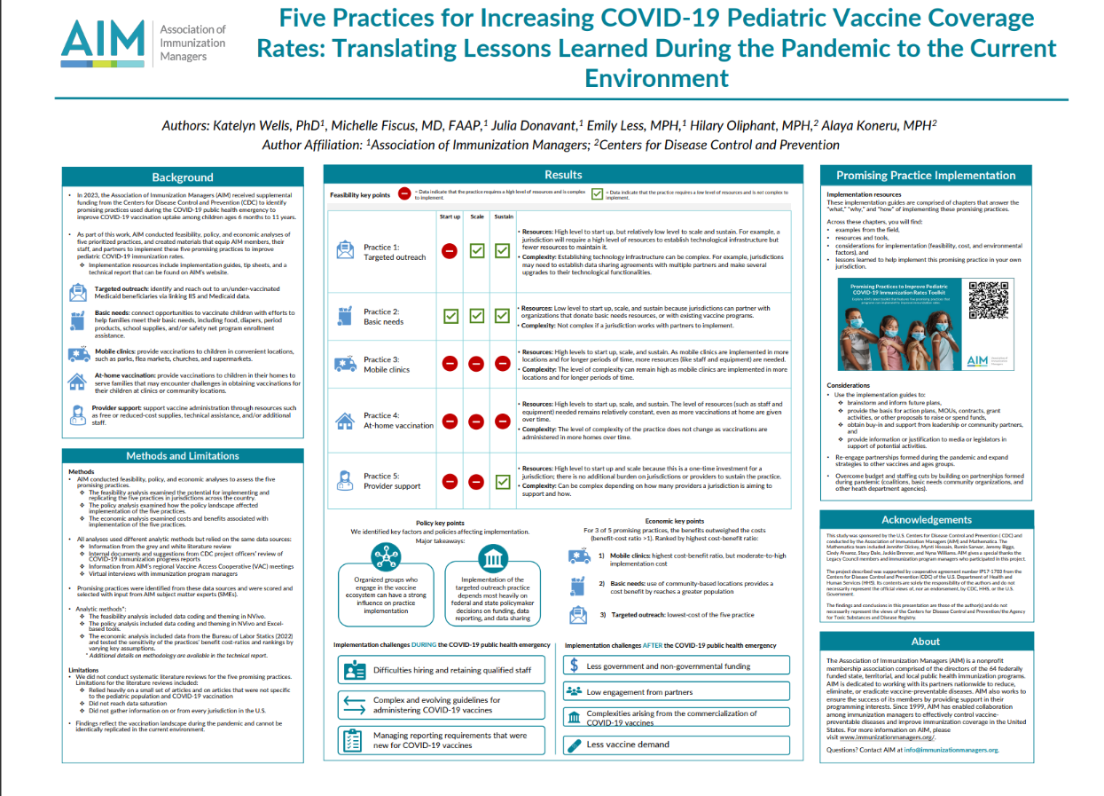 This AIM poster was displayed at the Centers for Disease Control and Prevention (CDC) 2024 National Immunization Conference (NIC) on AIM’s Promising Practices for Increasing COVID-19 Pediatric Vaccine Coverage Rates toolkit. AIM conducted feasibility, policy, and economic analyses of five practices used during the COVID-19 public health emergency to improve COVID-19 vaccination uptake among children ages 6 months to 11 years and created materials that equip AIM members, their staff, and partners to implement these five promising practices to improve COVID-19 immunization rates.