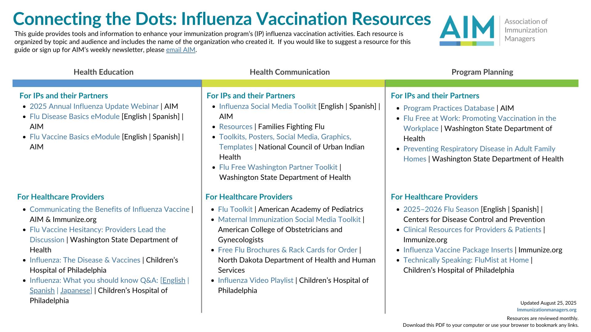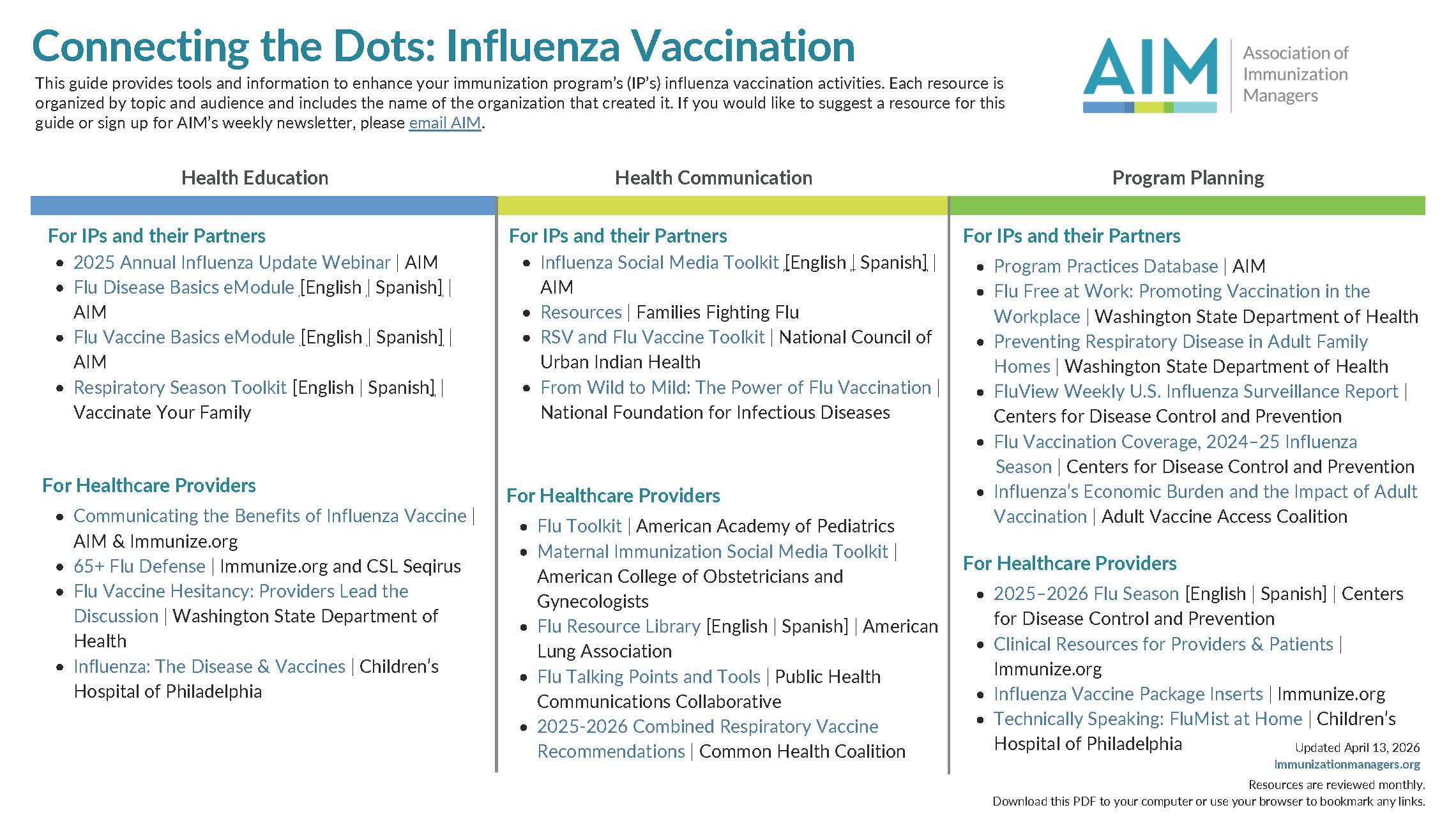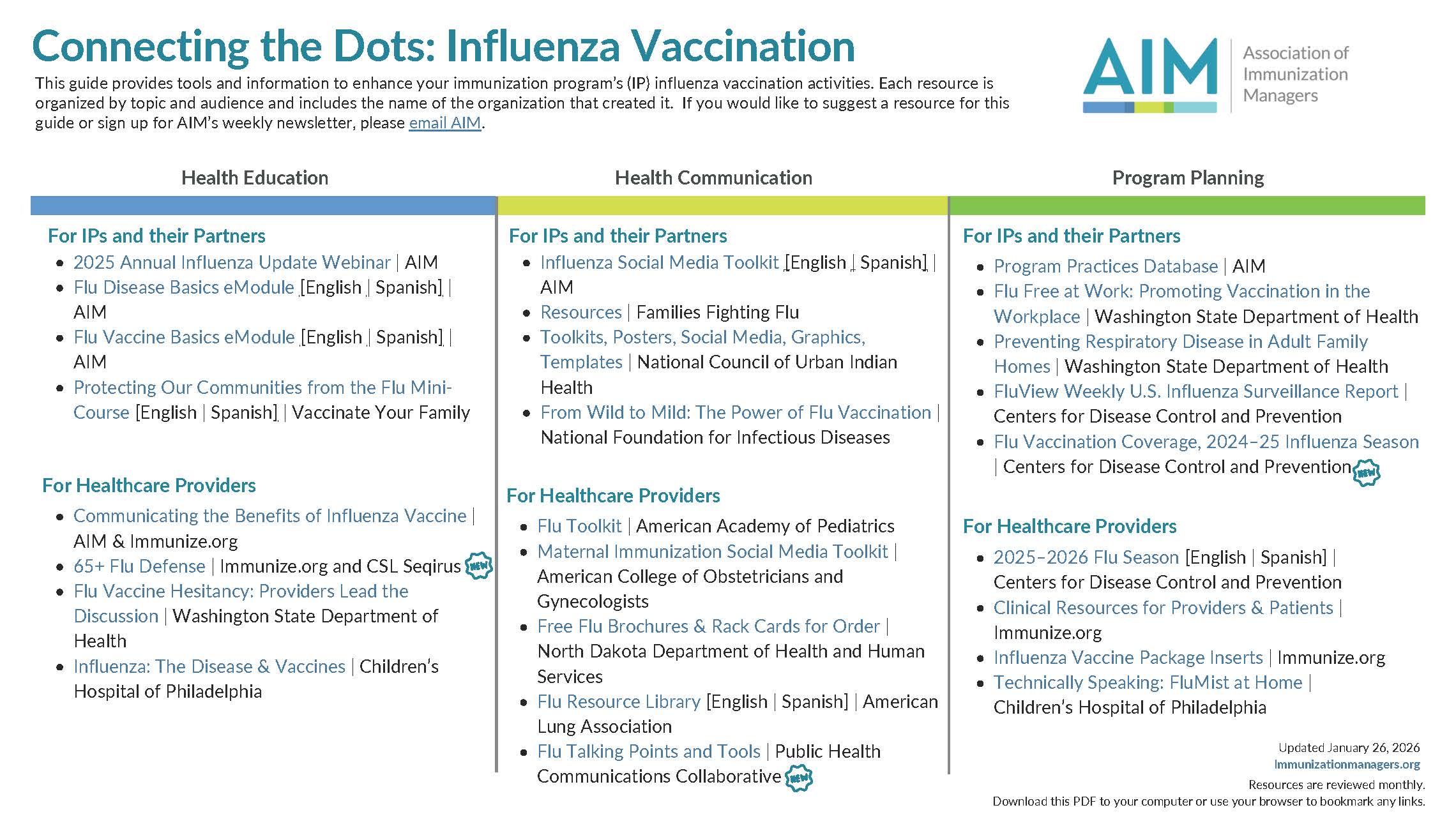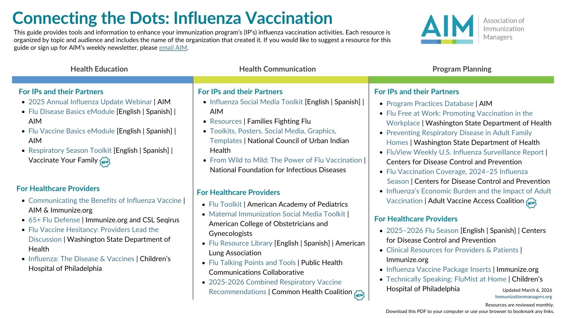 Updated monthly, Connecting the Dots serves as a centralized, go-to reference for influenza vaccination resources. If you have a resource to suggest for the next update, please email AIM.