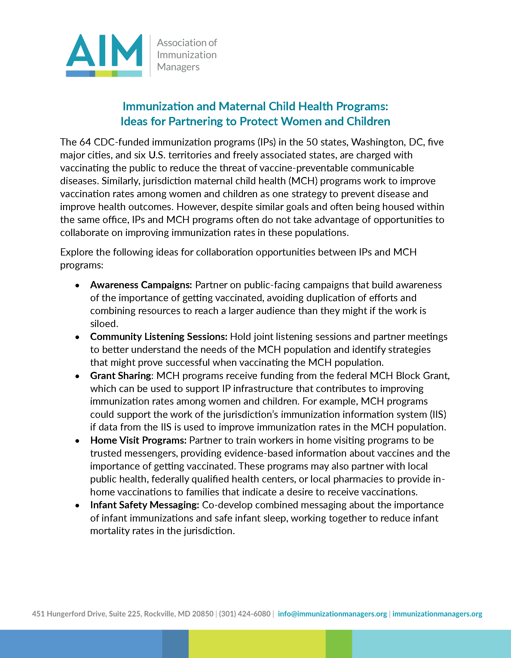Explore AIM’s one-pager about collaboration opportunities between immunization programs (IPs) and maternal child health (MCH) programs. Jurisdictional MCH programs work to improve vaccination rates among women and children as one strategy to prevent disease and improve health outcomes. Shared immunization goals to prevent disease and improve health outcomes open the door to collaboration opportunities between IP and MCH programs.