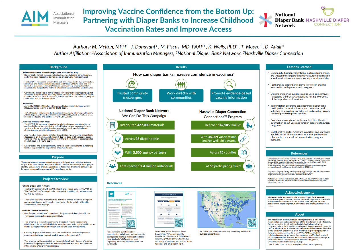 This AIM poster was displayed at the Centers for Disease Control and Prevention (CDC) 2024 National Immunization Conference (NIC) on immunization program and diaper bank partnerships. AIM partnered with the National Diaper Bank Network (NDBN) and Nashville Diaper Connection (NashDiaper) to identify and promote promising practices to foster non-traditional partnerships between immunization programs (IPs) and diaper banks. This poster highlights the successes of the NashDiaper Connections™ Program and NDBN “We Can Do This Campaign” in increasing public confidence in and uptake of vaccines while meeting the basic needs of children and their families.