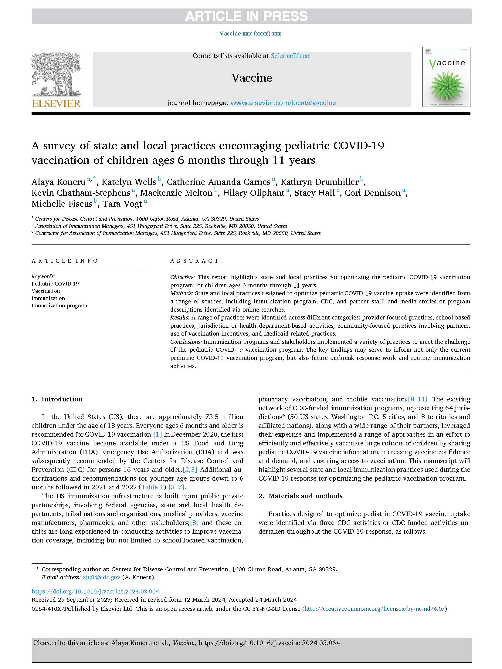 In early 2022, AIM held a series of listening sessions with CDC and program managers to understand the landscape of the national pediatric COVID-19 vaccination program for children ages five years and older and to prepare for anticipated COVID-19 vaccination program for children ages six months through 4 years. In AIM’s first collaborative article with CDC, this manuscript highlights state and local practices optimizing the pediatric COVID-19 vaccination program for children ages six months through 11 years. Practices were identified across several categories, including provider-focused practices, school-based practices, jurisdiction or health department-based activities, community-focused practices involving partners, use of vaccination incentives, and Medicaid-related practices.