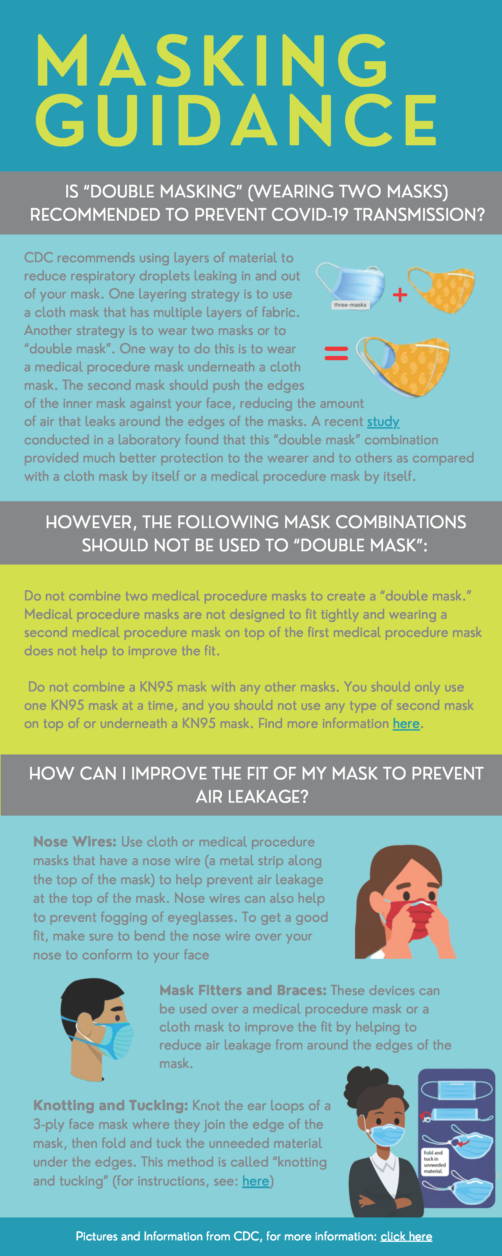 CDC recommends using layers of material to reduce respiratory droplets leaking in and out of your mask. One layering strategy is to use a cloth mask that has multiple layers of fabric. Another strategy is to wear two masks or to