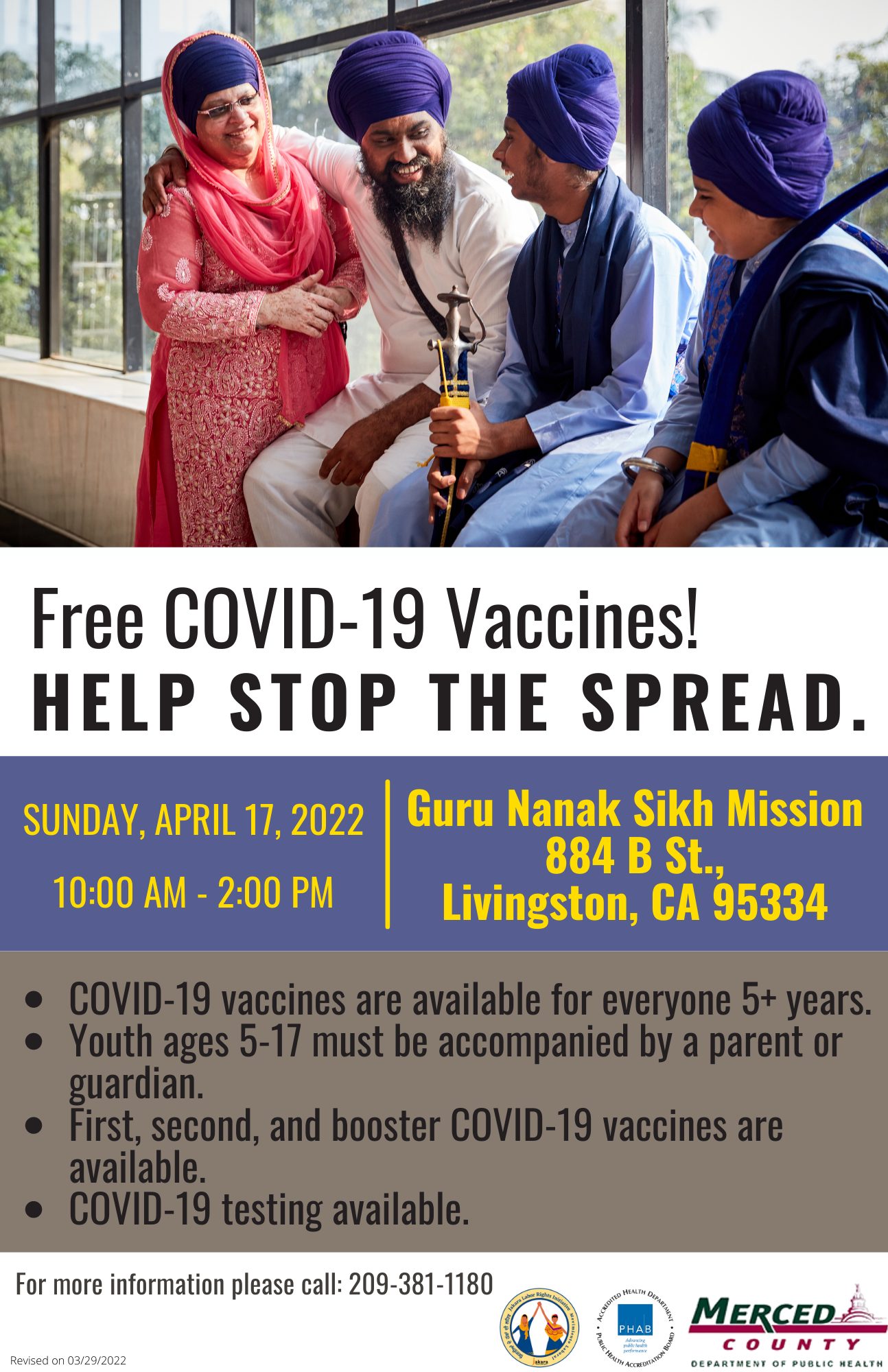 View a flyer, available in English, Spanish, and Punjabi, created by the Merced County Department of Public Health to promote a vaccination event at a local Sikh center in Merced, California. The department produced more than 700 social media posts related to COVID-19 and flu across Facebook and Instagram from January 2022 to June 2023. These posts, published mostly in English and Spanish, included mobile COVID-19 vaccination clinic event flyers and live-streaming video promotions. When additional language support was available, resources were translated into Hmong and Punjabi for clinics specifically aimed to increase vaccination among the Asian-American population. When the department partnered with local community-based organizations on COVID-19 and flu clinics, they included the organizations’ logos to increase publicity.