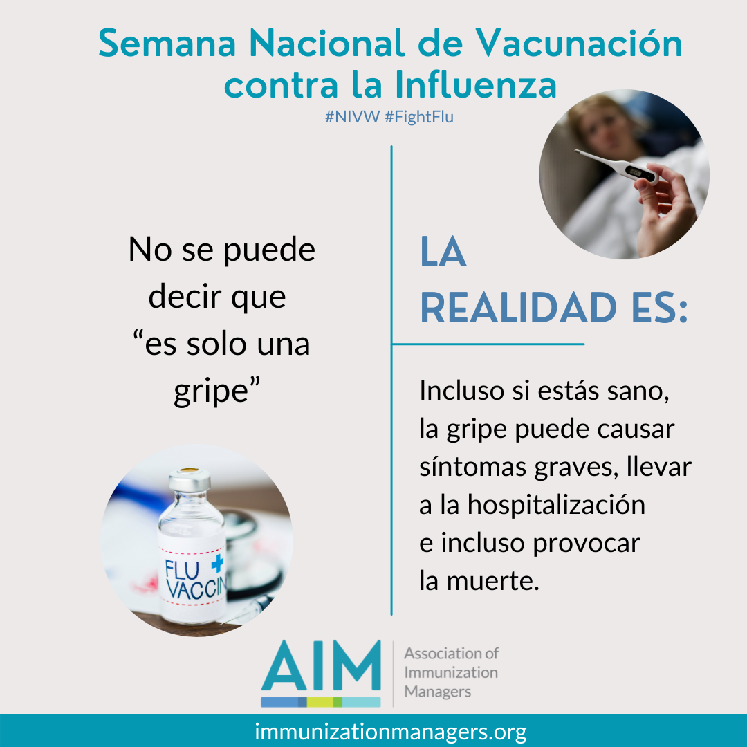 - Una idea errónea y común es que la gripe “no es gran cosa”, pero eso no es cierto. Incluso en una persona sana, la gripe puede provocar daños graves. La mejor protección contra la gripe es la inmunización. Protégete a tí mismo y a tus seres queridos esta Semana Nacional de Vacunación contra la Influenza ¡vacunándote! #FightFlu #NIVW