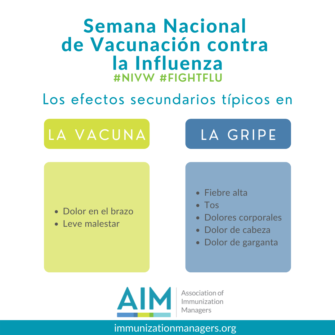 - La vacuna contra la gripe no contiene el virus vivo de la gripe y no puede enfermarte. Los efectos secundarios de la vacuna, como dolor en el brazo o molestias leves, son comunes y generalmente desaparecen en pocos días. ¡Únete a la lucha contra la influenza este año, programando tu cita durante la Semana Nacional de Vacunación contra la Influenza! #NIVW #FightFlu