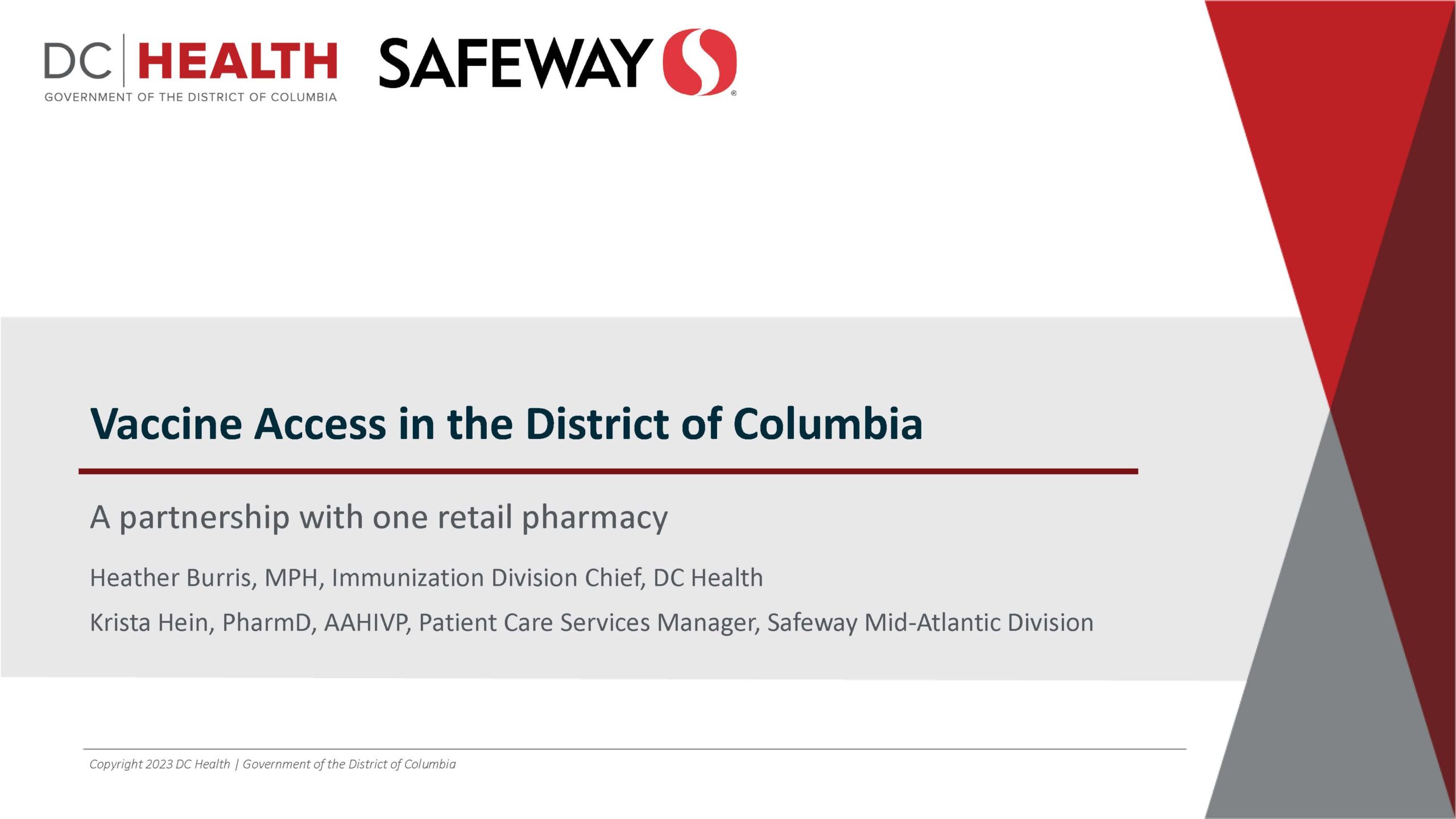 At the Northeast and Mid-Atlantic VAC meetings, DC Health presented results and lessons learned from its partnership with a Safeway retail pharmacy. The partnership’s goal was to secure vaccine access in Washington, DC. Heather Burris, DC program manager, and Krista Hein, patient care services manager of Safeway Mid-Atlantic division, presented.