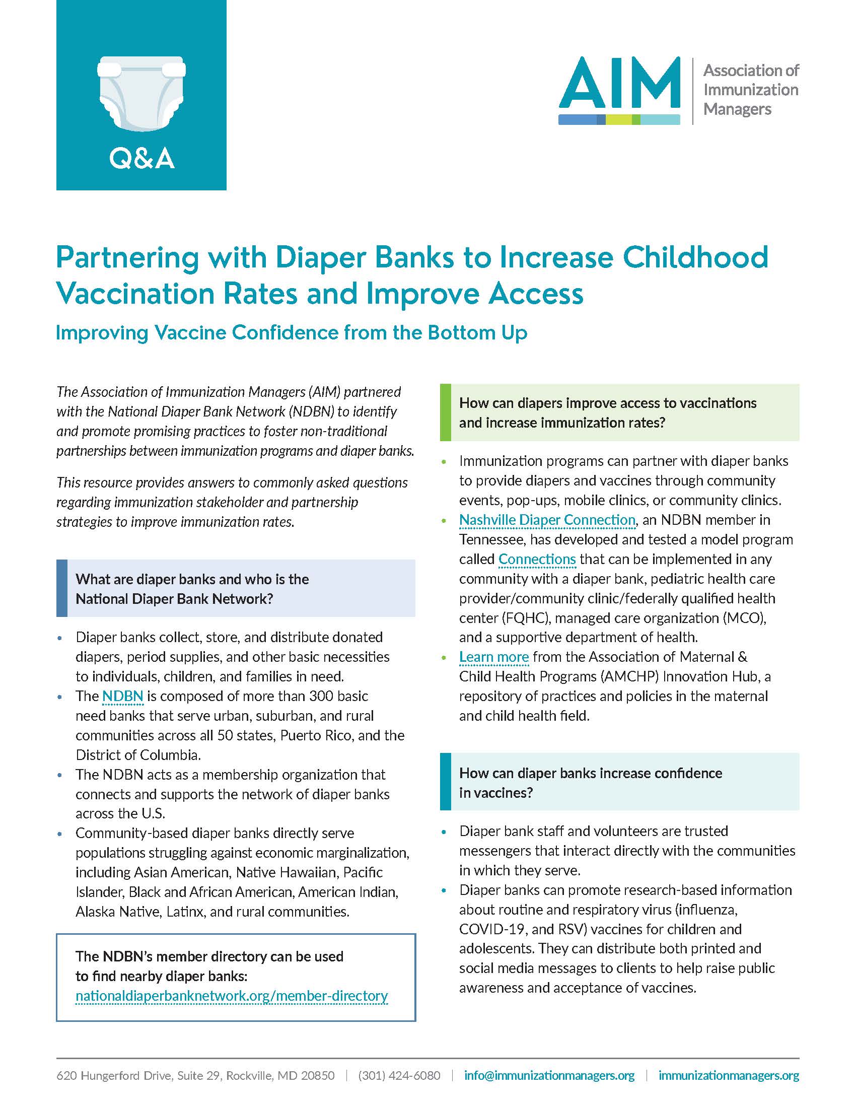 AIM partnered with the National Diaper Bank Network (NDBN) to identify and promote promising practices to foster non-traditional partnerships between immunization programs and diaper banks. This resource provides answers to commonly asked questions regarding immunization stakeholder and partnership strategies to improve immunization rates.