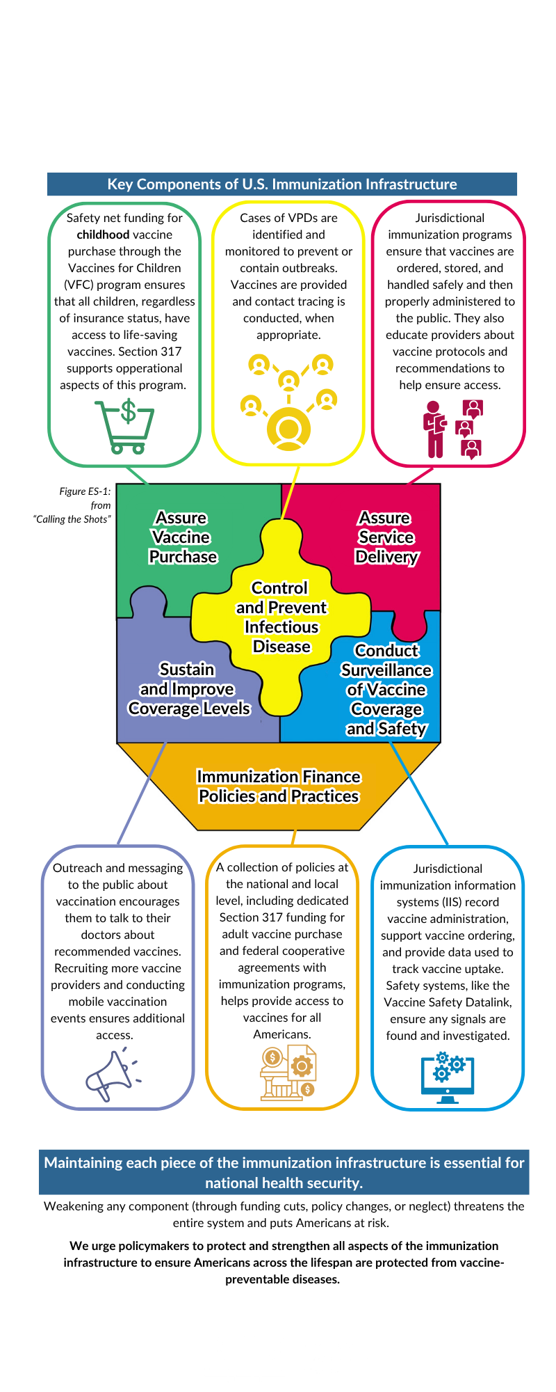 The nation’s protection against vaccine-preventable diseases (VPDs) depends on complex, interconnected components that together comprise our nation’s vaccine infrastructure. Each piece is vital—remove or weaken one, and the whole system is at risk.