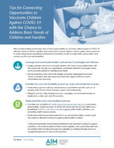 This tip sheet provides key considerations and implementations tips for immunization programs when implementing partnerships that connect opportunities to vaccinate children against COVID-19 with the chance to address families’ basic needs.