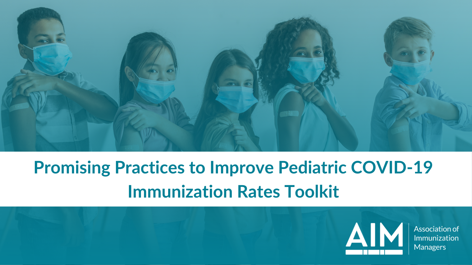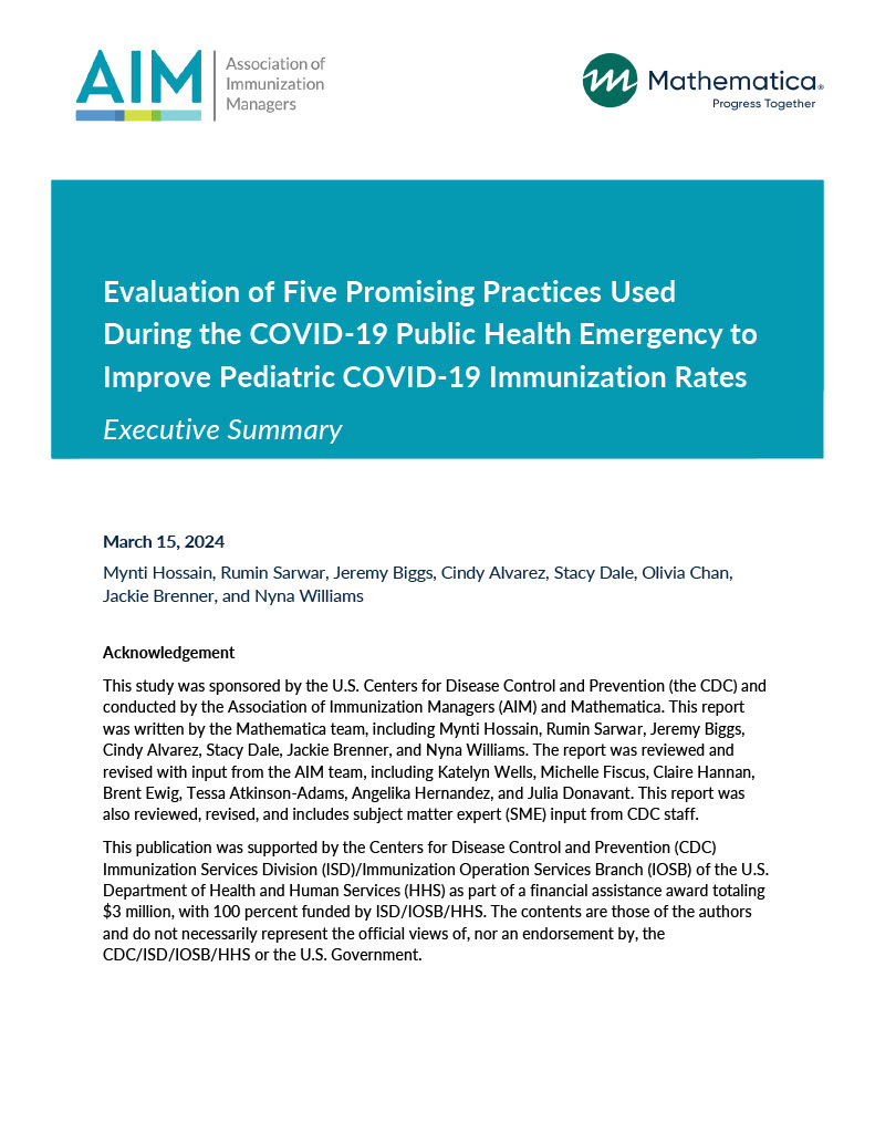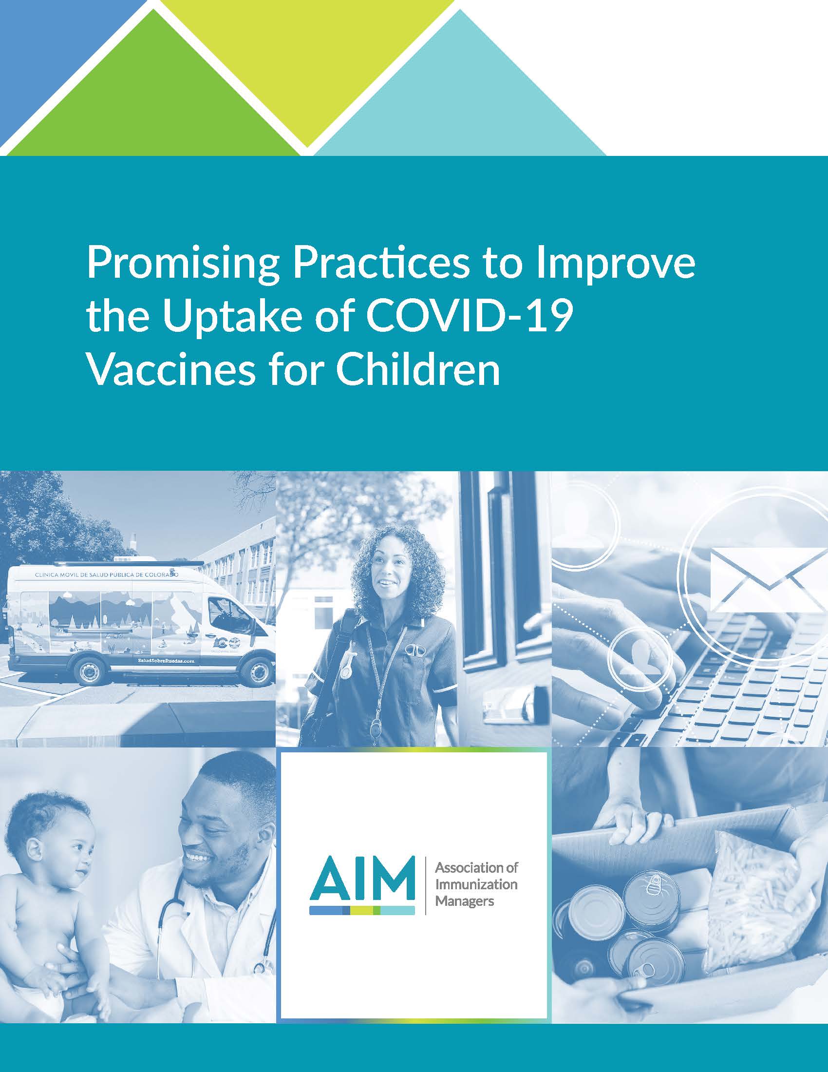 In 2023, the Association of Immunization Managers (AIM) received supplemental funding from the Centers for Disease Control and Prevention (CDC) to identify promising practices used during the COVID-19 public health emergency to improve COVID-19 vaccination uptake among children ages 6 months to 11 years. As part of this work, AIM conducted feasibility, policy, and economic analyses of five prioritized practices and created materials that equip AIM members, their staff, and partners to implement these five promising practices to improve COVID-19 immunization rates.