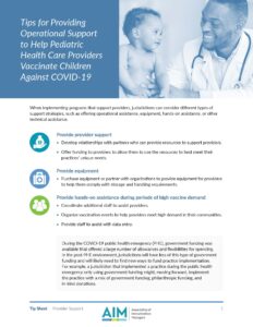 This tip sheet provides key considerations and implementation tips for immunization programs when implementing operational support to help pediatric health care providers vaccinate children against COVID-19.