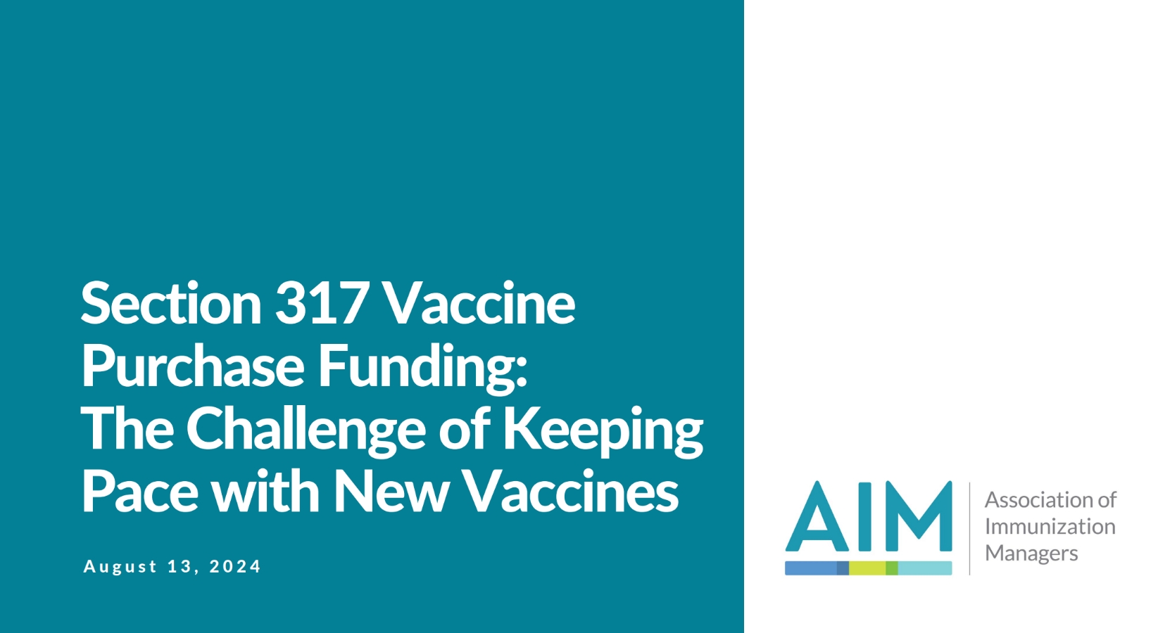 This AIM presentation was given at the Centers for Disease Control and Prevention (CDC) 2024 National Immunization Conference (NIC) on the Section 317 vaccine purchasing and the challenge of keeping pace with new vaccines. Section 317 provides funding for the purchase of vaccine for uninsured adults and outbreak response. Despite the addition of several vaccines to CDC’s adult immunization schedule, Section 317 funding has been relatively fixed. Comparing Section 317 funding to the cost of adult vaccines provides important insight into the challenges associated with vaccinating uninsured adults. The presentation also gave an overview on the challenge of vaccinating uninsured adult populations with limited public funding, providing examples from three jurisdictions.