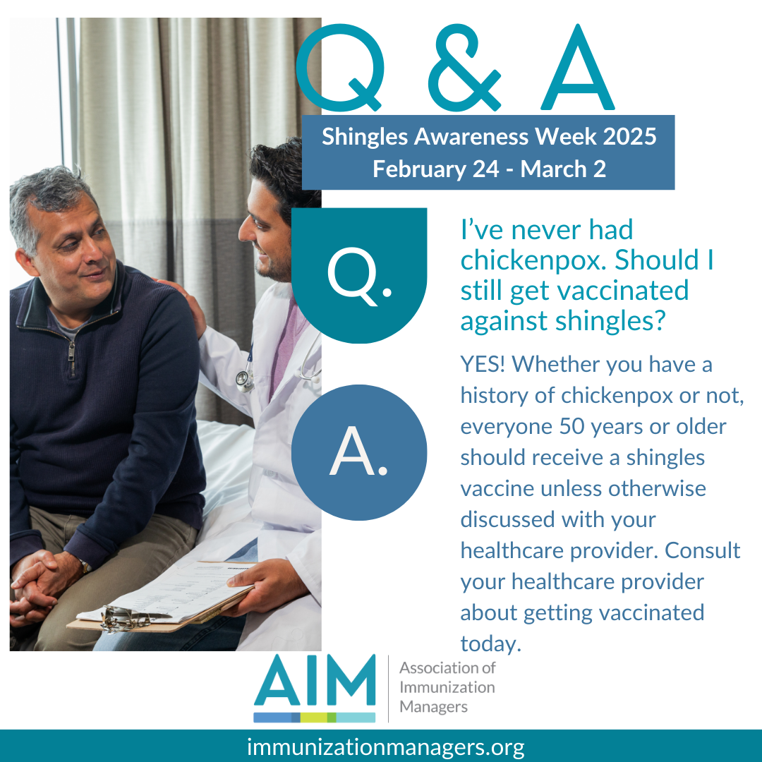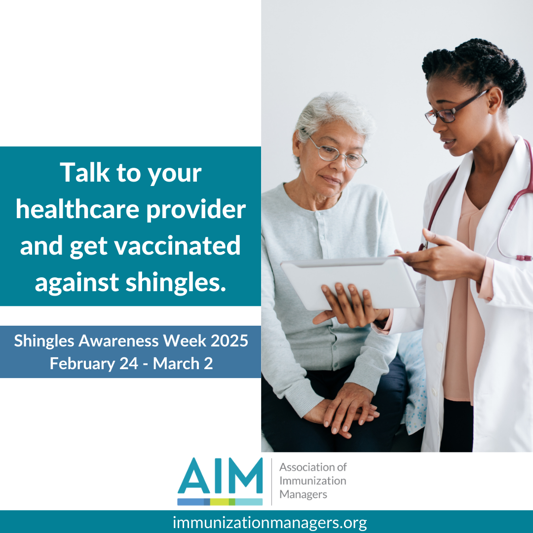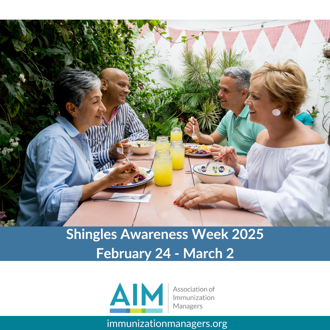 The fourth annual Shingles Awareness Week is from February 24-March 2, 2025. Shingles Awareness Week was established to raise awareness around misconceptions about the risks of developing shingles. Over 90% of adults over the age of 50 already carry the virus that causes shingles and over 30% of adults will develop shingles in their lifetime. However, a global survey of adults aged 50 and above showed that only ~7% believe they are at high risk of developing shingles. Join AIM in highlighting the importance of getting vaccinated against shingles!