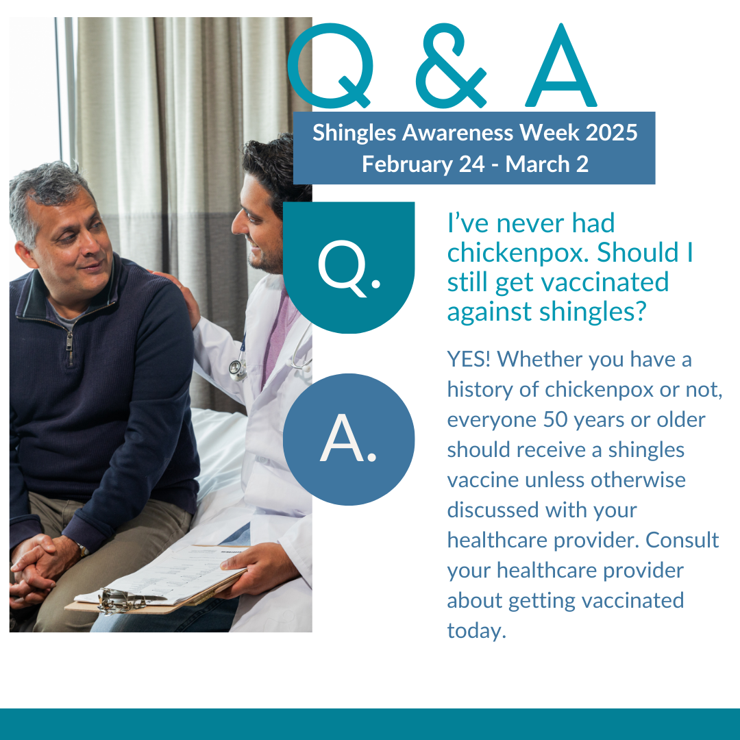 - A: YES! Whether you have a history of chickenpox or not, everyone 50 years or older should receive a shingles vaccine unless otherwise discussed with your healthcare provider. Adults under age 50 who are immunocompromised may also be eligible. Questions? Consult your healthcare provider about getting vaccinated today.