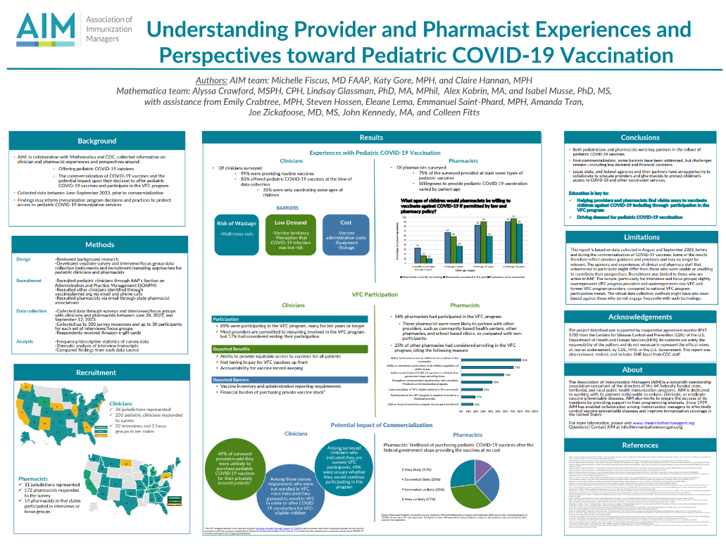 This AIM poster was displayed at the Centers for Disease Control and Prevention (CDC) 2024 National Immunization Conference (NIC) and is about understanding provider and pharmacist experiences and perspectives toward pediatric COVID-19 vaccination. AIM, in collaboration with Mathematica and CDC, collected information on clinician and pharmacist experiences and perspectives around offering pediatric COVID-19 vaccines and the commercialization of COVID-19 vaccines and the potential impact upon their decision to offer pediatric COVID-19 vaccines and participate in the VFC program. Data were collected between June-September 2023, prior to commercialization, and findings may inform immunization program decisions and practices to protect access to pediatric COVID-19 immunization services.